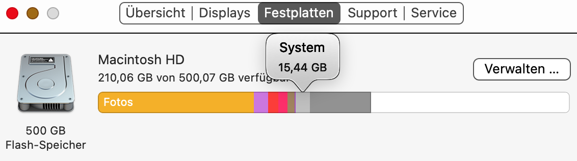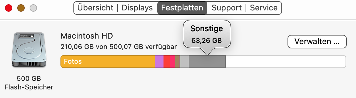 Sonstige: Enthält Dateien, die keiner der hier aufgelisteten Kategorien angehören. Diese Kategorie enthält überwiegend Dateien und Daten, die vom System verwendet werden, beispielsweise Protokolldateien, Caches, VM-Dateien und Laufzeit-Systemressourcen. Ebenfalls enthalten sind temporäre Dateien, Schriften, App-Support-Dateien und Plug-Ins. Du kannst die Inhalte in dieser Kategorie nicht verwalten. Die Inhalte werden von macOS verwaltetet und die Größe der Kategorie variiert abhängig vom aktuellen Status deines Mac.