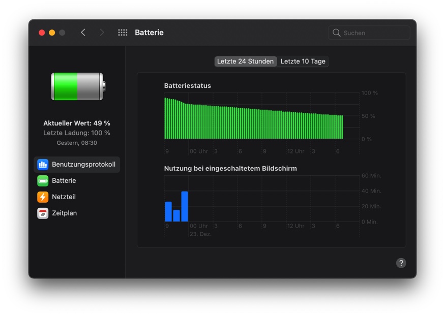 Im Bild seht ihr, dass der Laptop von 0 Uhr Nachts bis zum nächsten Tag 18 Uhr nicht benutzt wurde und die Batterie stetig abnimmt. Aber von was?
