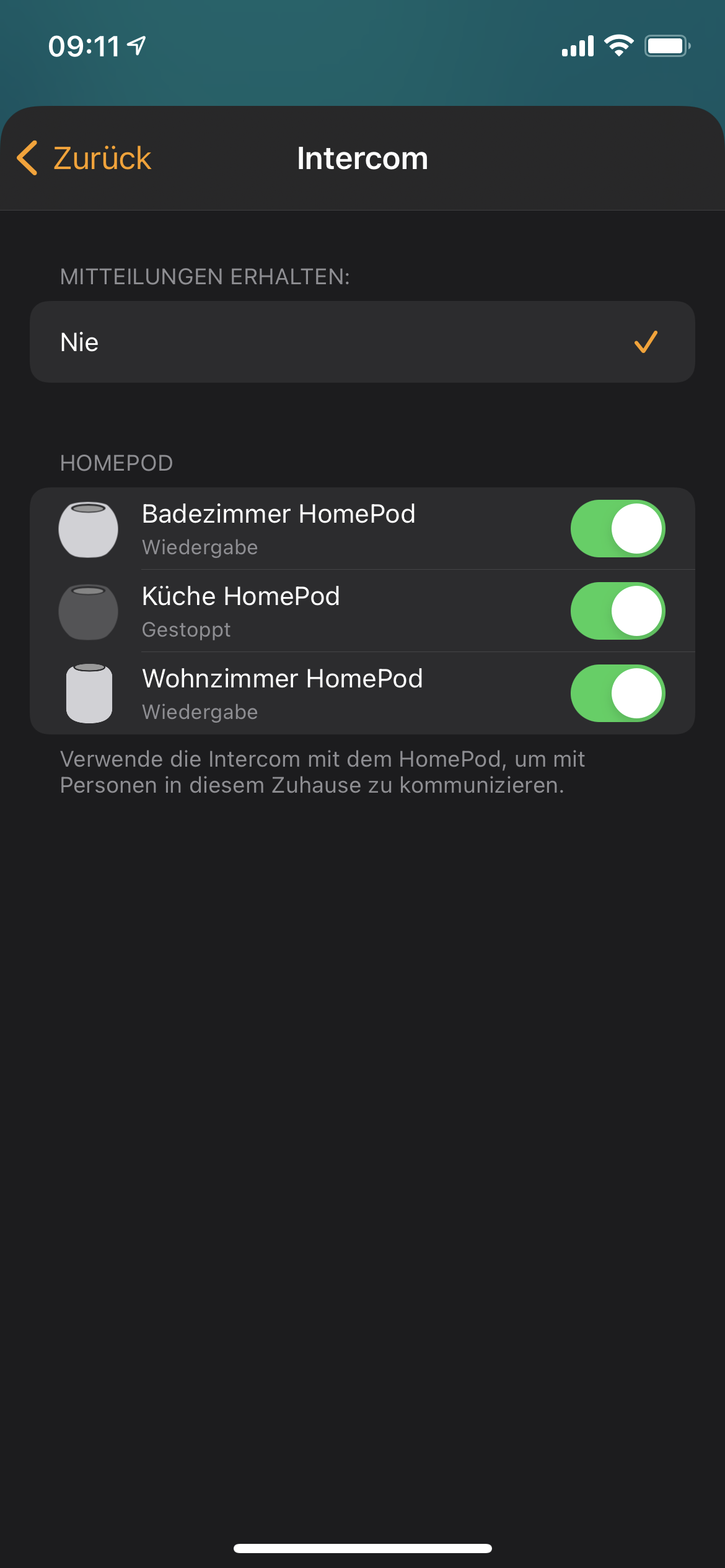 Ich bin seit kurzem HomePod Nutzer. Leider funktioniert auf meinem iPhone (12 pro mit iOS 14.3) die Auswahl der intercom Nachrichten nicht. Es stand von Anfang an immer nur „nie“ zur Verfügung.
