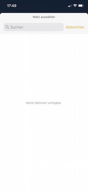 Es lassen sich im Widget weder Notizen-Ordner noch Einzelnotizen (4te Widget-Option) zur Anzeige auswählen, da der jeweilige Dialog leer bleibt.
