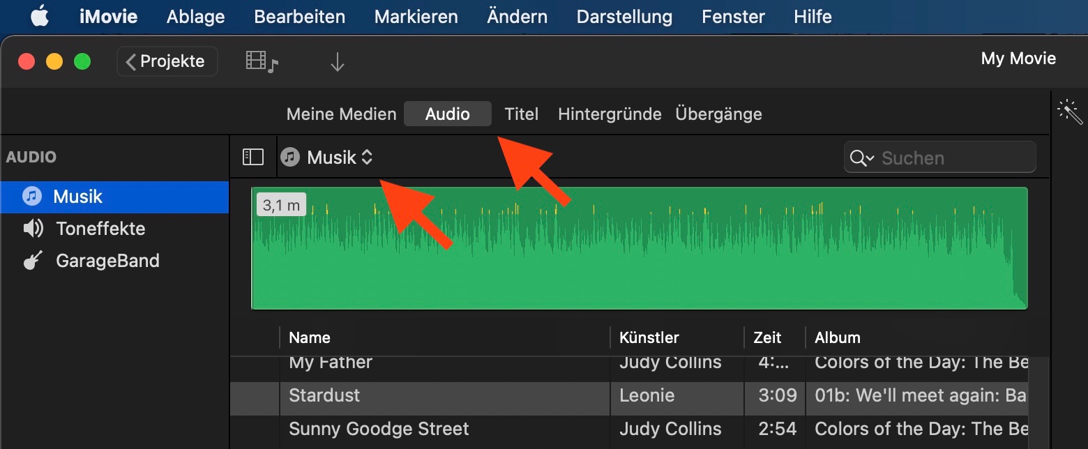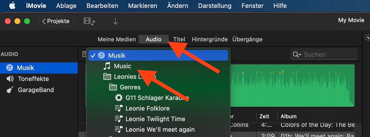 Ich kann im iMovie Programm bei Musik keine Datei oder Titel aus der iTunes Bibliothek in den Film integrieren. Verwendung nur für eigenen Bedarf. Im Ordner Musik erscheinen nur 2 Musiktitel die ich irgendwann mal importiert habe, Das Problem besteht seit der Neuen Software Mac OS Big Sur. Auf meinem iPad funktioniert es.