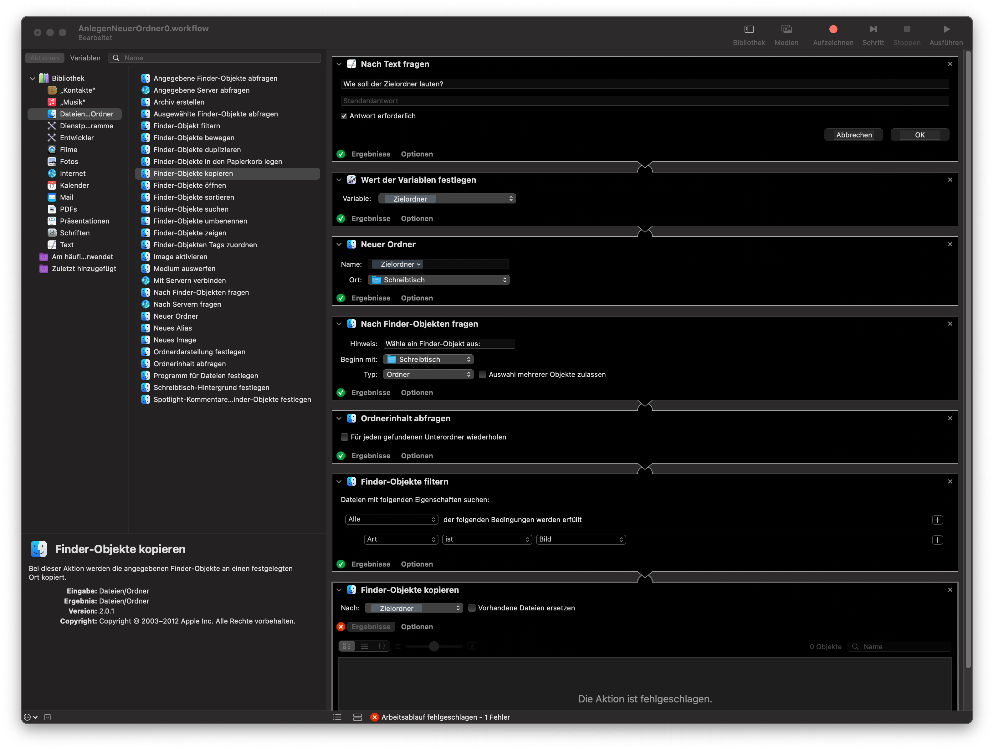 Ich suche nach einer Erklärung, warum mein Automator - Workflow stets zu einem Fehler führt.