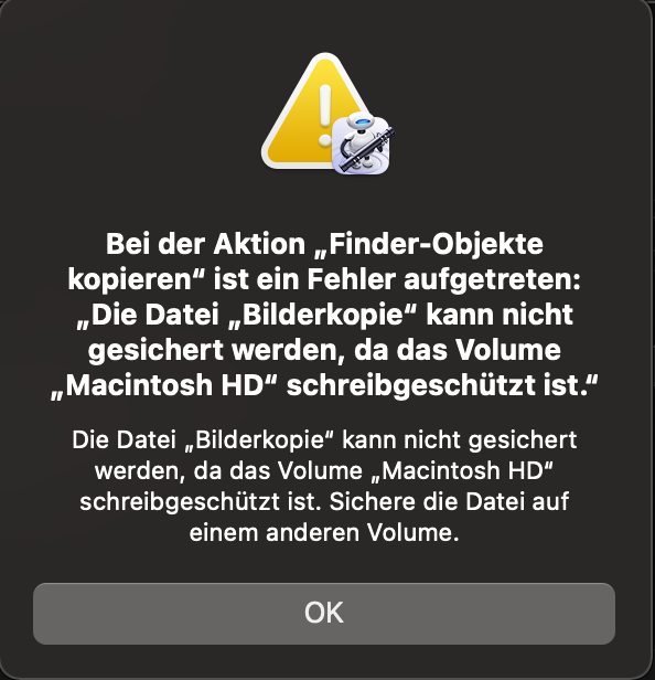 Bis zum letzten Schritt im Workflow funktioniert noch alles. Der Zielordner wird korrekt angelegt und aus dem Quellordner werden die Dateiinhalte korrekt ermittelt. Jedoch erhalte ich beim Kopiervorgang stets folgende Fehlermeldung: "Bei der Aktion "Finder-Objekte kopieren" ist ein Fehler aufgetreten: "Die Datei "Bilderkopie" kann nicht gesichert werden, da das Volume "Macintosh HD" schreibgeschützt ist." Sichere die Datei auf einem anderen Volume."