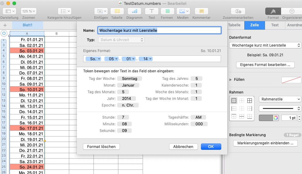 Numbers.app: Alle Sonntage in einer Datumsspalte rot markieren