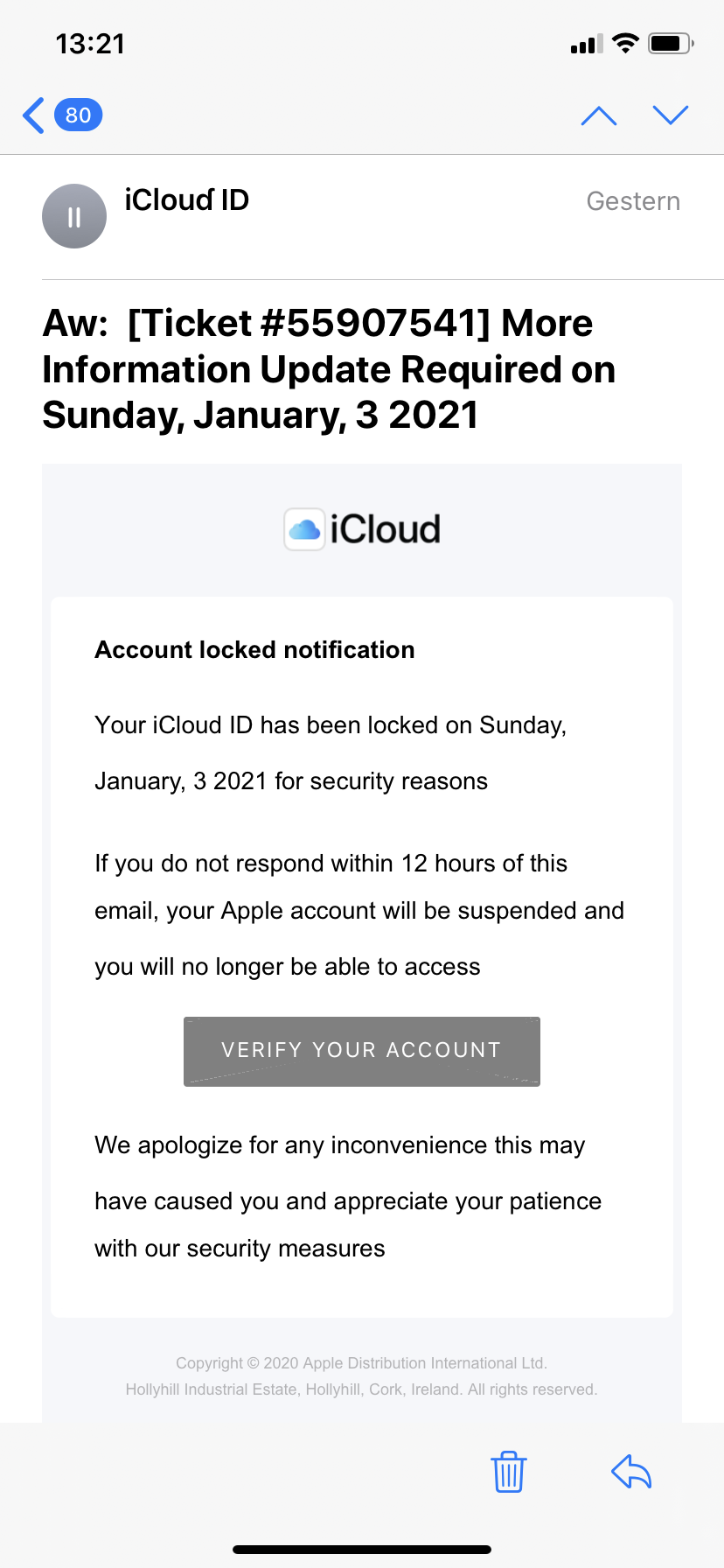 Hallo ich habe Mail erhalten dass meine iCloud ID gesperrt wurde und wenn ich mein Konto nicht verifiziere es innerhalb von 24 h für immer gesperrt wird.