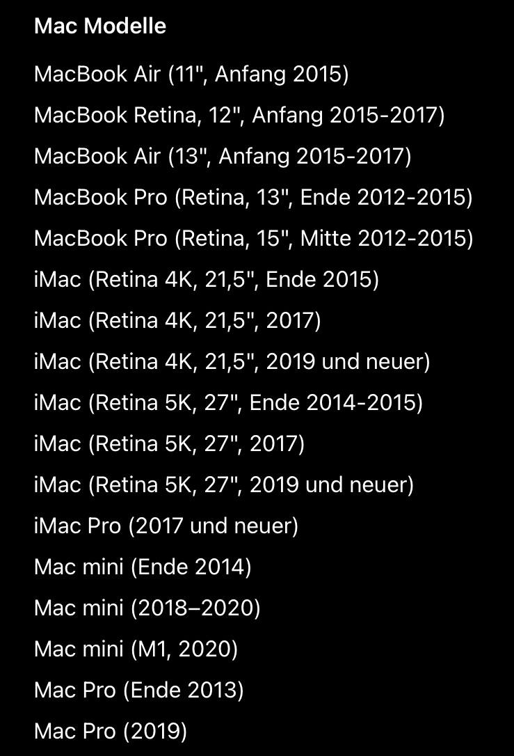Auf der Hilfeseite https://support.apple.com/de-de/HT207816 stand MacBook Pro-Modelle aus dem Jahr 2016 oder neuer!