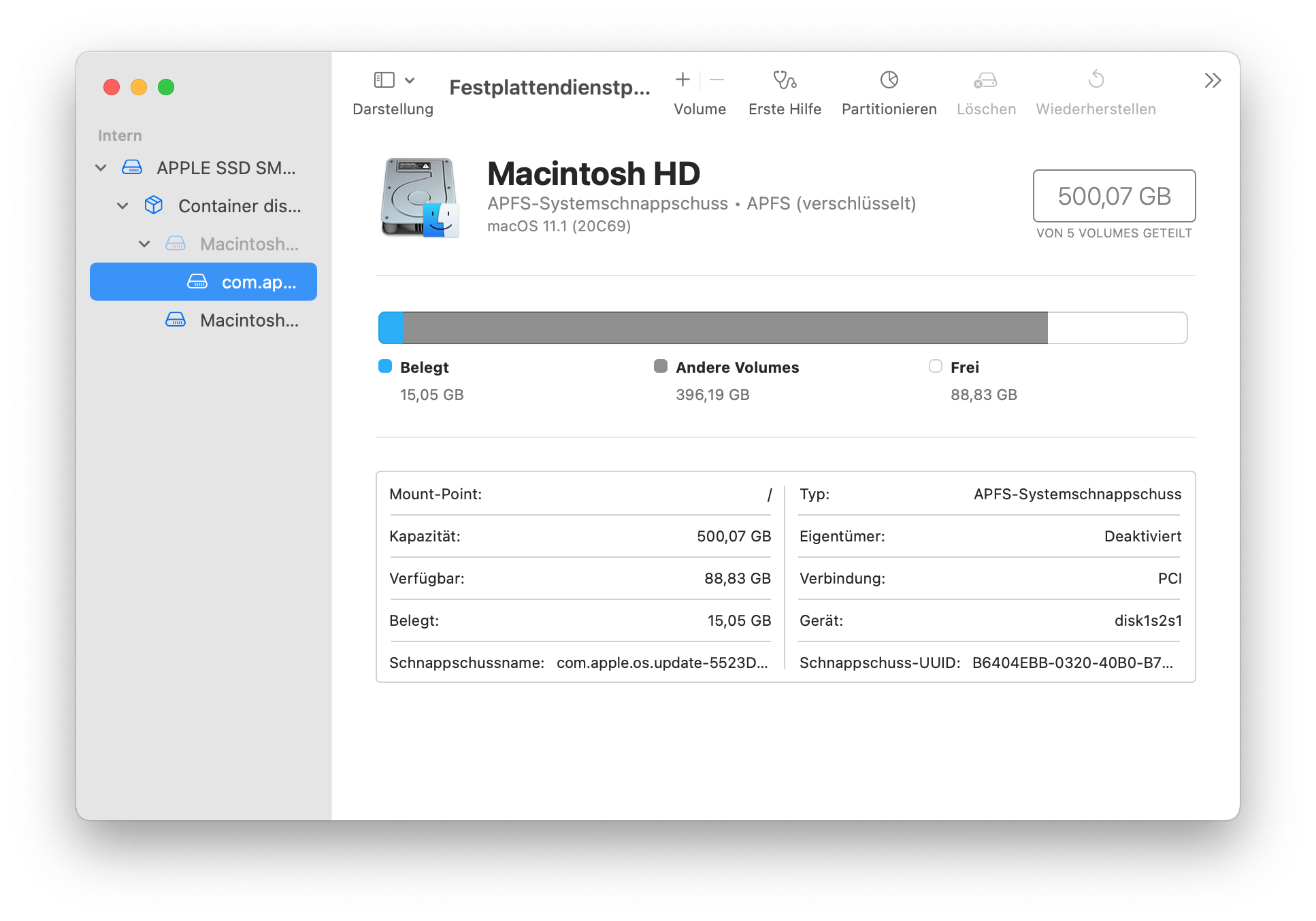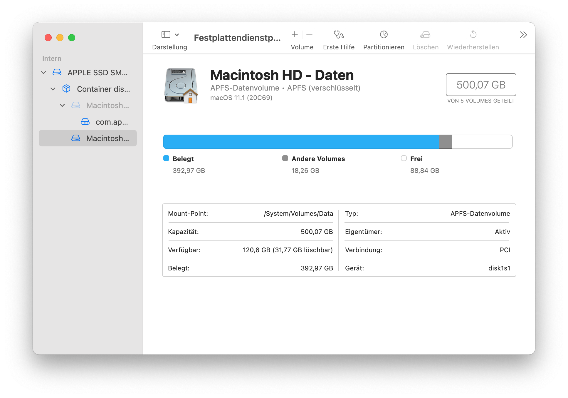 Dein Hauptspeicher ist die Apple SSD oberster Punkt, dann siehst du bei Apple HD dass diese mit 15,05 GB belegt ist (blauer Balken, grau ist die Apple HD Daten). Diese ist mit 392,97 GB belegt.