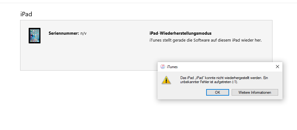 iPad mit dem PC verbunden, es wurde erkannt, es wurden updats heruntergeladen. Kurz vor ende der aktualisierung kommt ddie Fehlermeldung bei iTunes, das das iPad nicht erkannt wird. Auf dem iPad ist das Logo zu sehen und den Übertragungsbalken. Wenn das Datenkabel aus dem iPad entfernt wird kommt wieder die Aufforderung es mit dem PC zu verbinden.