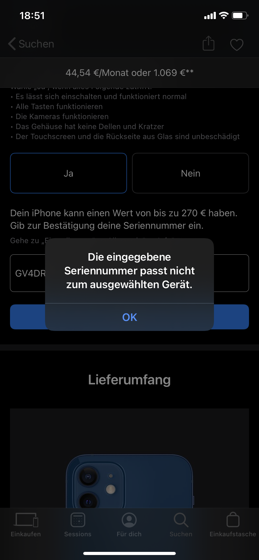 Apple-Trade-In Seite erkennt Seriennummer nicht