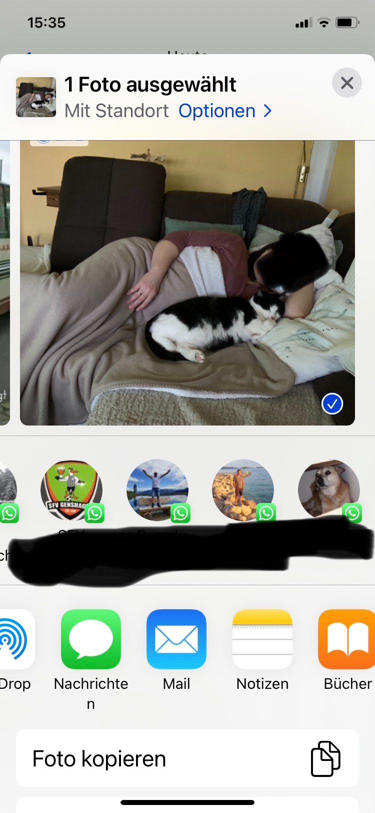 Meine Frage wenn ich in die App Fotos gehe und ein Bild auswähle lässt sich das Bild nicht per WhatsApp versenden der Button wird auch nicht angezeigt! Wenn ich aber in Fotos zwei Bilder auswähle und auf versenden drücke ist der WhatsApp Button auf einmal da uns es funktioniert???