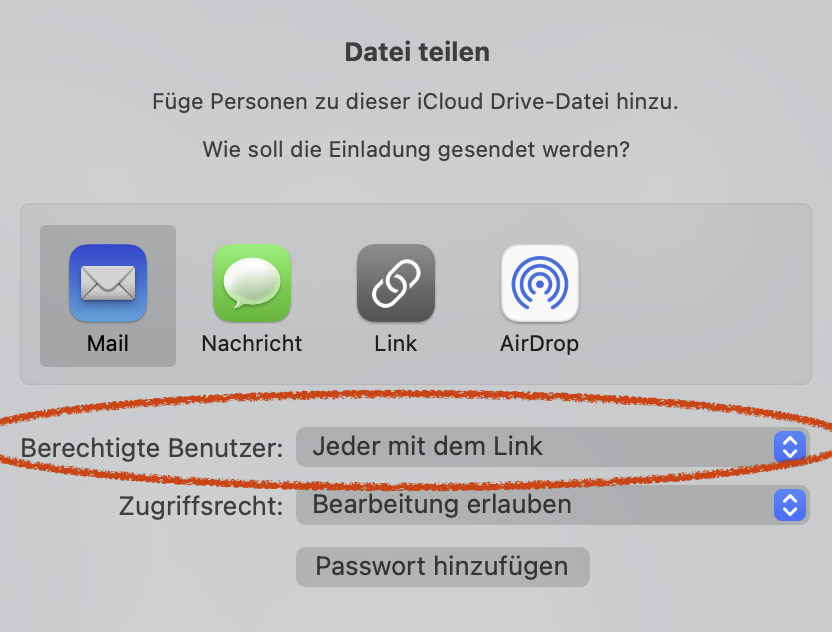 einladen kannst Du auch Personen, die keine Apple-ID haben. Wichtig ist dabei, im Auswahlfenster als Berechtigte Benutzer die Option "Jeder mit dem Link" anzuklicken (siehe Abb.).