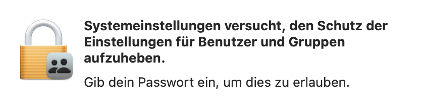 Hi, ich habe vorgestern auf Big Sur upgedatet und habe heute bemerkt, dass ich keinen Zugriff mehr auf meine Systempasswörter habe. Mein Anmeldepasswort funktioniert und kann auch geändert werden - bislang war das Anmeldepasswort immer auch das Passwort, das ich für Systemänderungen (z.B. durch Öffnen des Schlosses in den Systemeinstellungen) verwendet habe (siehe Bild). Ich bin Administrator und alleiniger Nutzer des Macbooks. Wie kann ich das Passwort zurücksetzen bzw. warum unterscheidet es sich vom Anmeldepasswort?