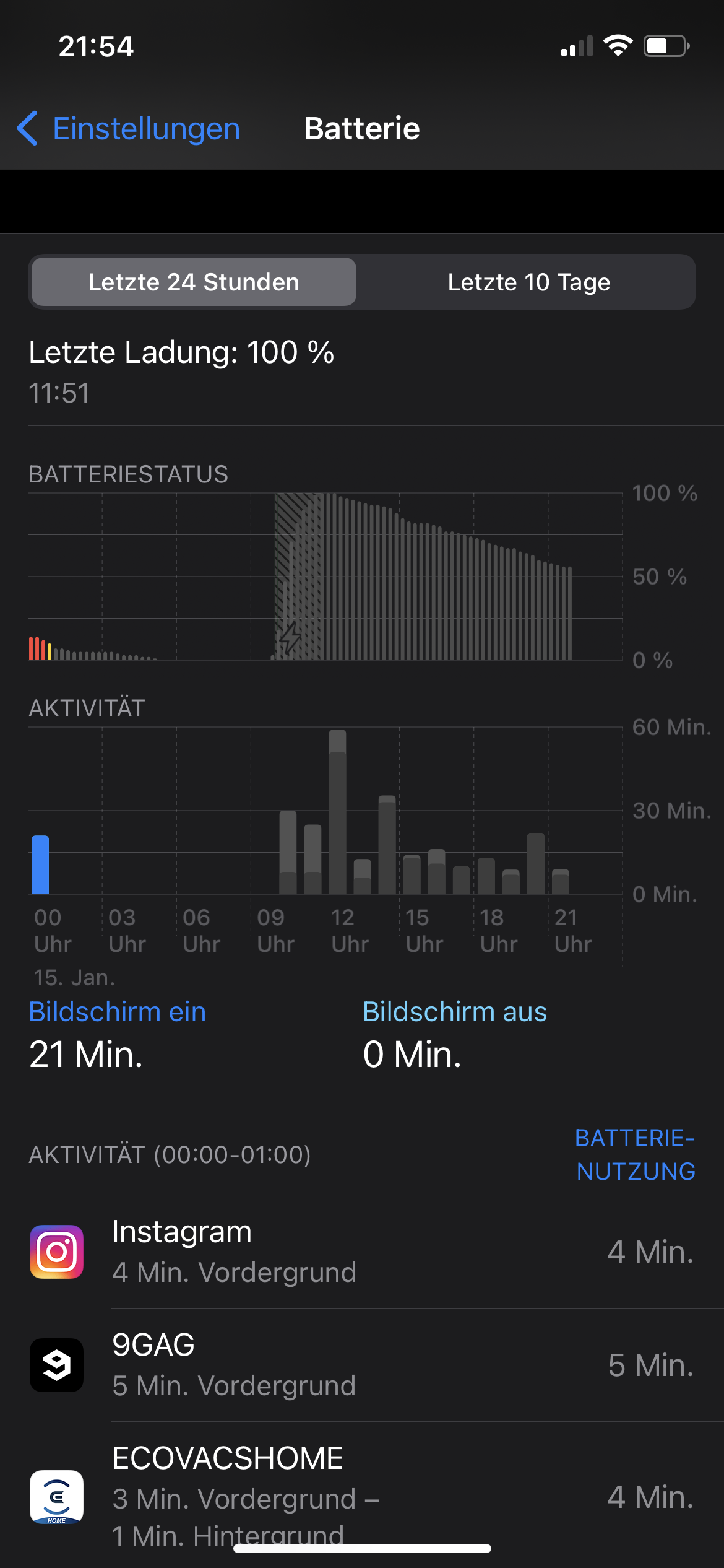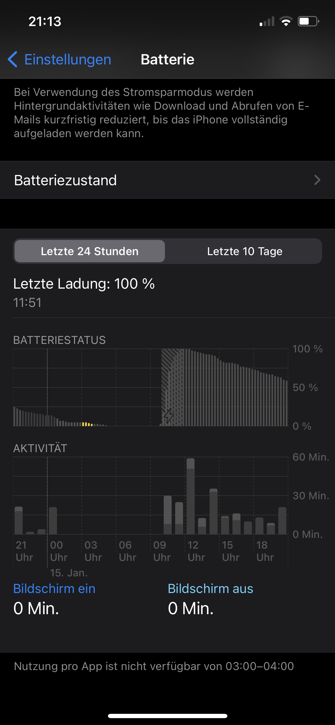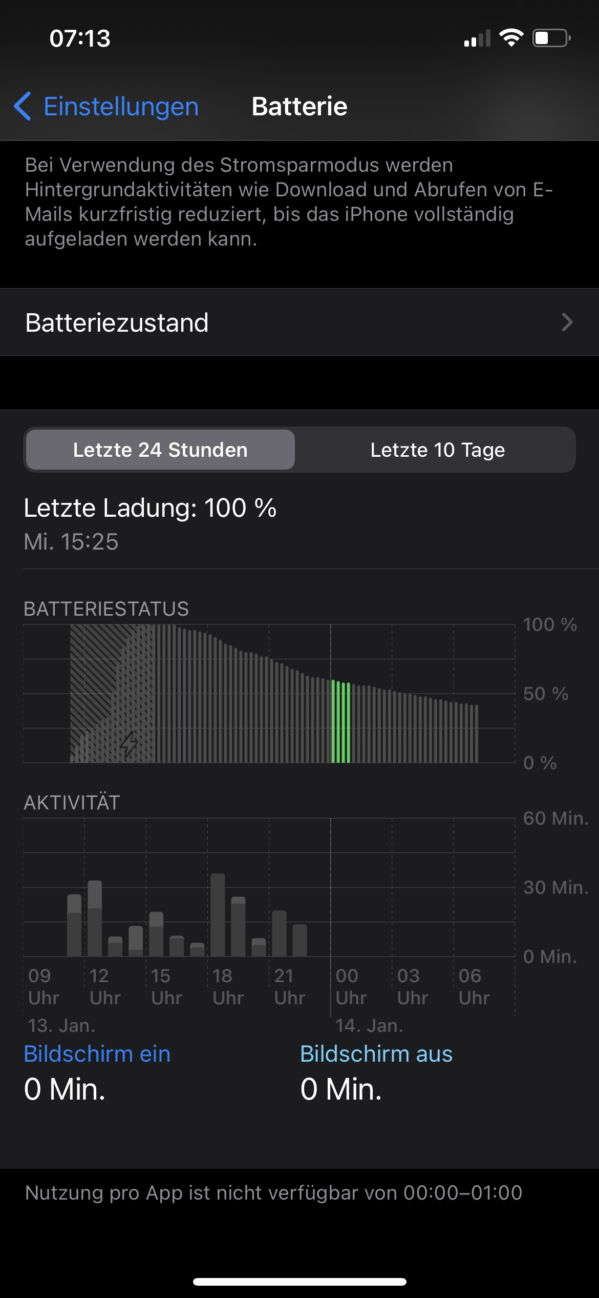 Ausserdem scheinst du dein iPhone gelöscht zu haben. Danach braucht er einige Zeit um wieder Infos anzuzeigen. Vielleicht gelingt es dir, wenn die Statistik vorhanden ist in ein paar Stunden, etwas zu erkennen. Also schau dann mal auf dieser Seite weiter unten. Da ist eine Liste von Apps. Über der Liste steht rechts "Aktivität anzeigen". Das tippe bitte an. Da kannst du sehen welche App wie viele Minuten genutzt wurde und welche App wie viele Minuten im Hintergrund gearbeitet hat. Siehst du da eine App mit vielen Hintergrund-Minuten. Vielleicht willst du diese App dann doch in der Hintergrundaktualisierung ausschalten. Und noch mal: die findest du unter Einstellungen unter Allgemein und Hintergrundaktualisierung.