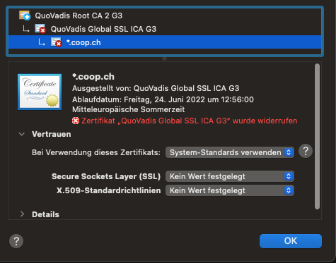 Seit Kurzem funktioniert der Zugriff auf die Webseite eines grossen Schweizer Detailhandels mit vier Buchstaben nicht. Es erscheint die Meldung, dass sie Seite nicht privat sei. Unter Details sehe ich, dass ein Zertifikat widerrufen wurde.