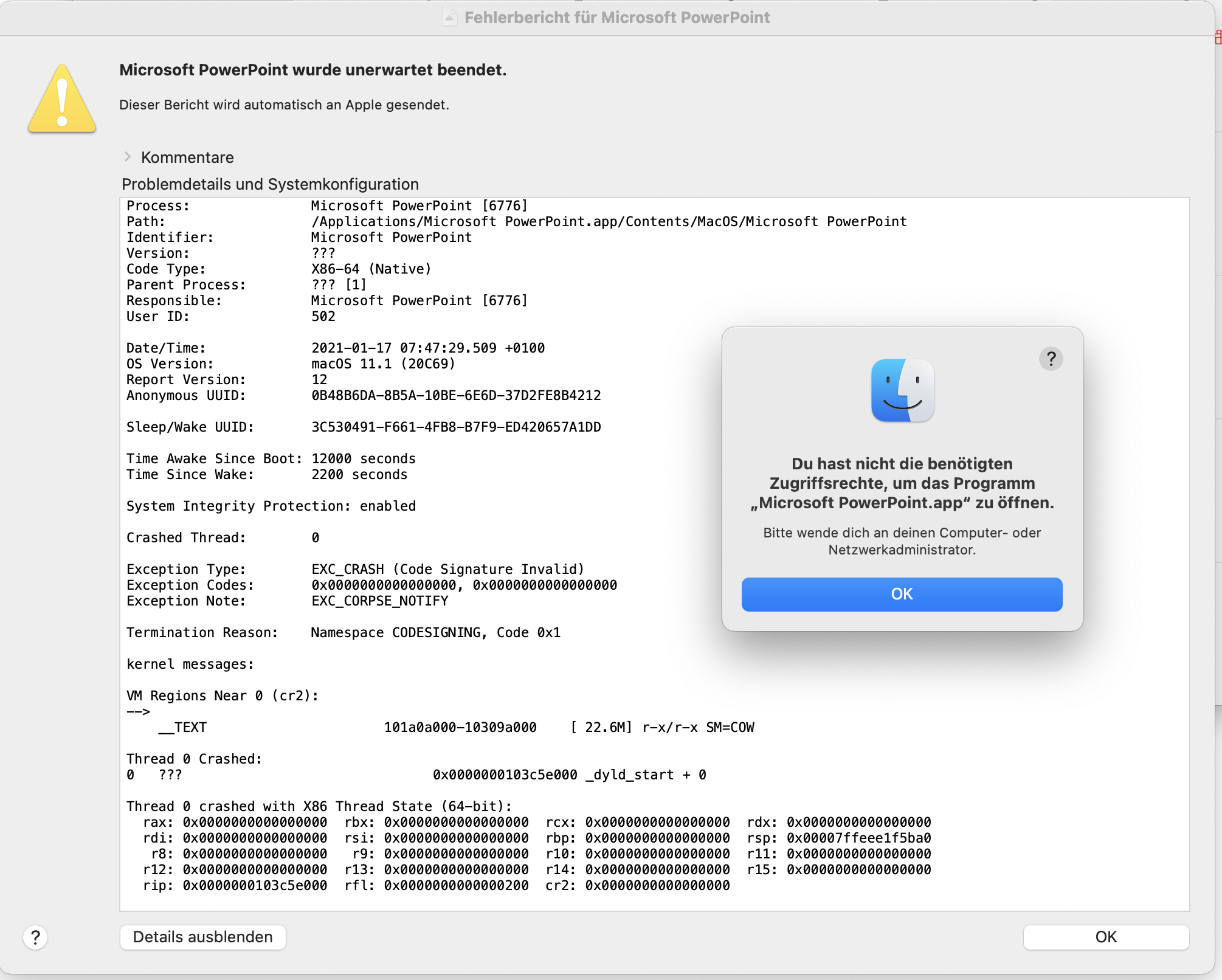 Bei Starten der Programme kommt zunächst "Du hast nicht die ...", danach Fehlerbericht für Microsoft PowerPoint bzw. Excel oder Word. Bei Mail kommt nur der Fehlerbericht.