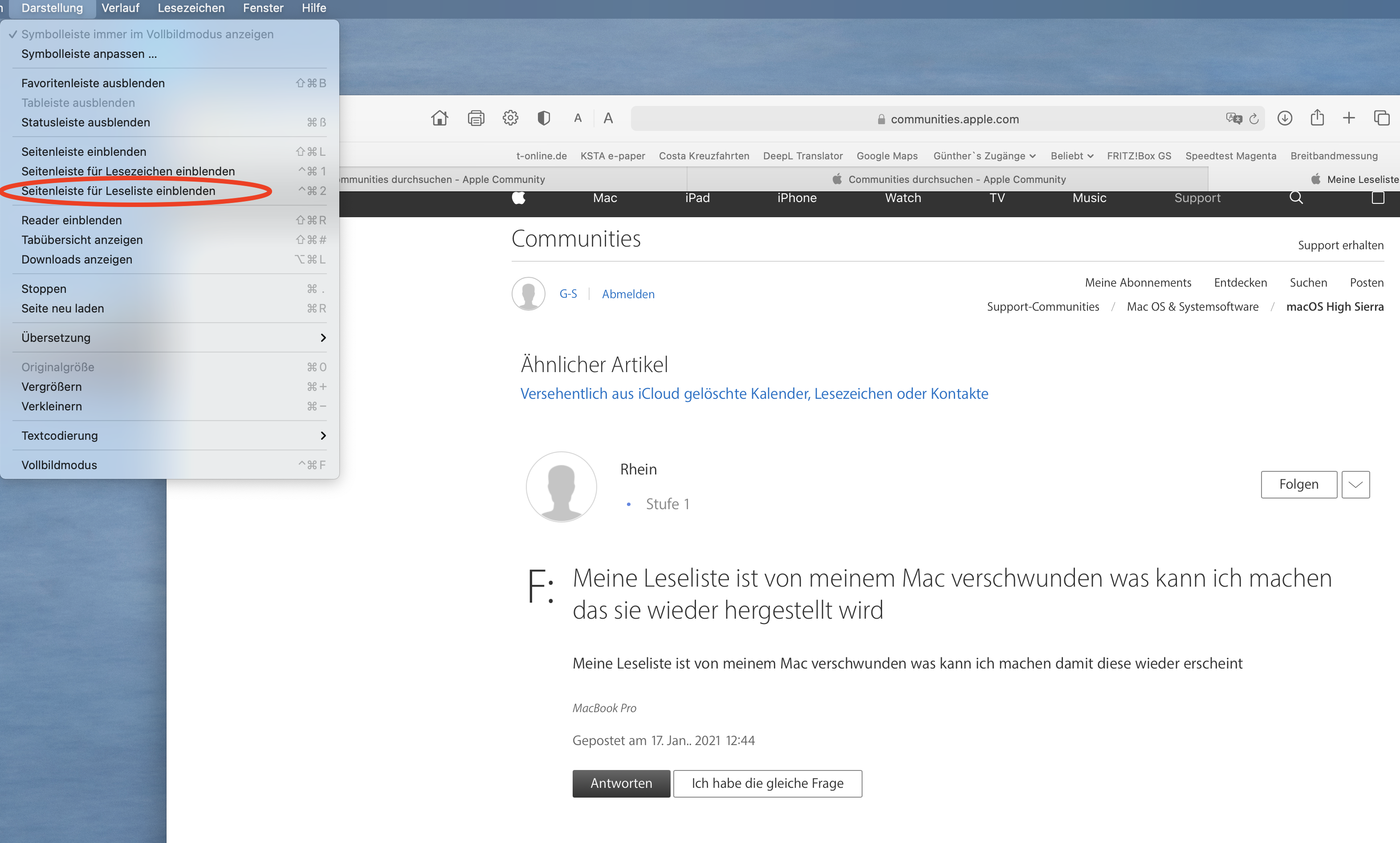 Leseliste ist vom MacBook verschwunden