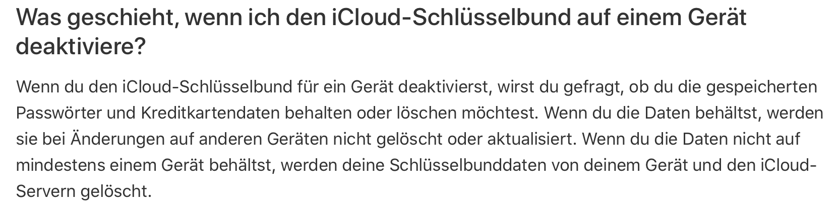Vielen Dank für die Hilfe. Ich hatte das gleiche Problem: Wie oben beschrieben, wurde mein Schlüsselbund nicht synchronisiert, daher wollte ich ihn deaktivieren, um die Synchronisation wieder neu zu starten. Das gelang auf keinem meiner Geräte iPhone, iPad und Mac.