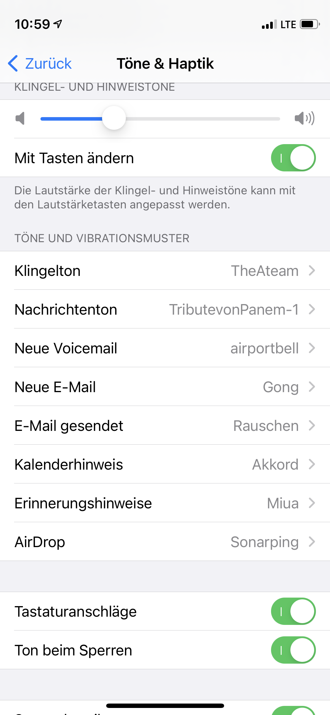 Ich möchte den Standard Mitteilungston ändern. Bei mir erscheinen Banner-Mitteilungen und Mitteilungen auf dem Sperrbildschirm stets mit dem klassischen“Dreiklang“ Ich habe diesen Ton nirgends bewusst eingestellt, noch habe ich eine Einstellungsseite gefunden, wo er per default eingestellt ist. Leider ist das auch bei anderen iPhones in meiner Familie der Fall und so schaut stets jeder nach, wer denn nun eine Mitteilung erhalten hat. Das ist zum einen unerfreulich und auch unangenehm. Meine Einstellungen „Töne & Haptik“ habe ich beigefügt.