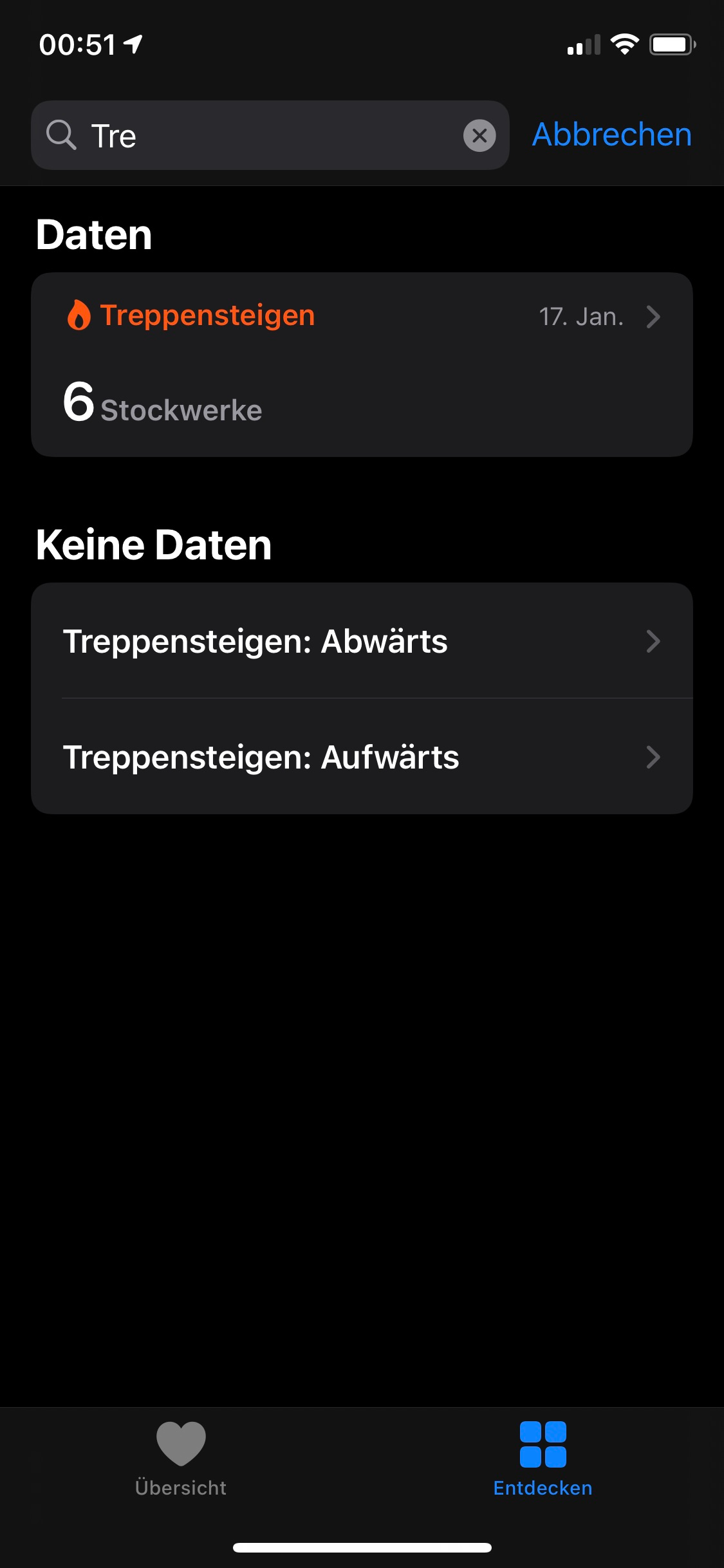 In der Health-App sind für beide Vorgänge keine Daten verfügbar, wobei der Grund darin liegen dürfte, dass für beide Vorgänge auch keine Datenquellen verfügbar sind. Ich habe ein iPhone X (iOS 14.3), gekoppelt mit einer Apple Watch 4 (watchOS 7.2). Welche Geräte liefern Daten für das Treppensteigen auf- und abwärts?