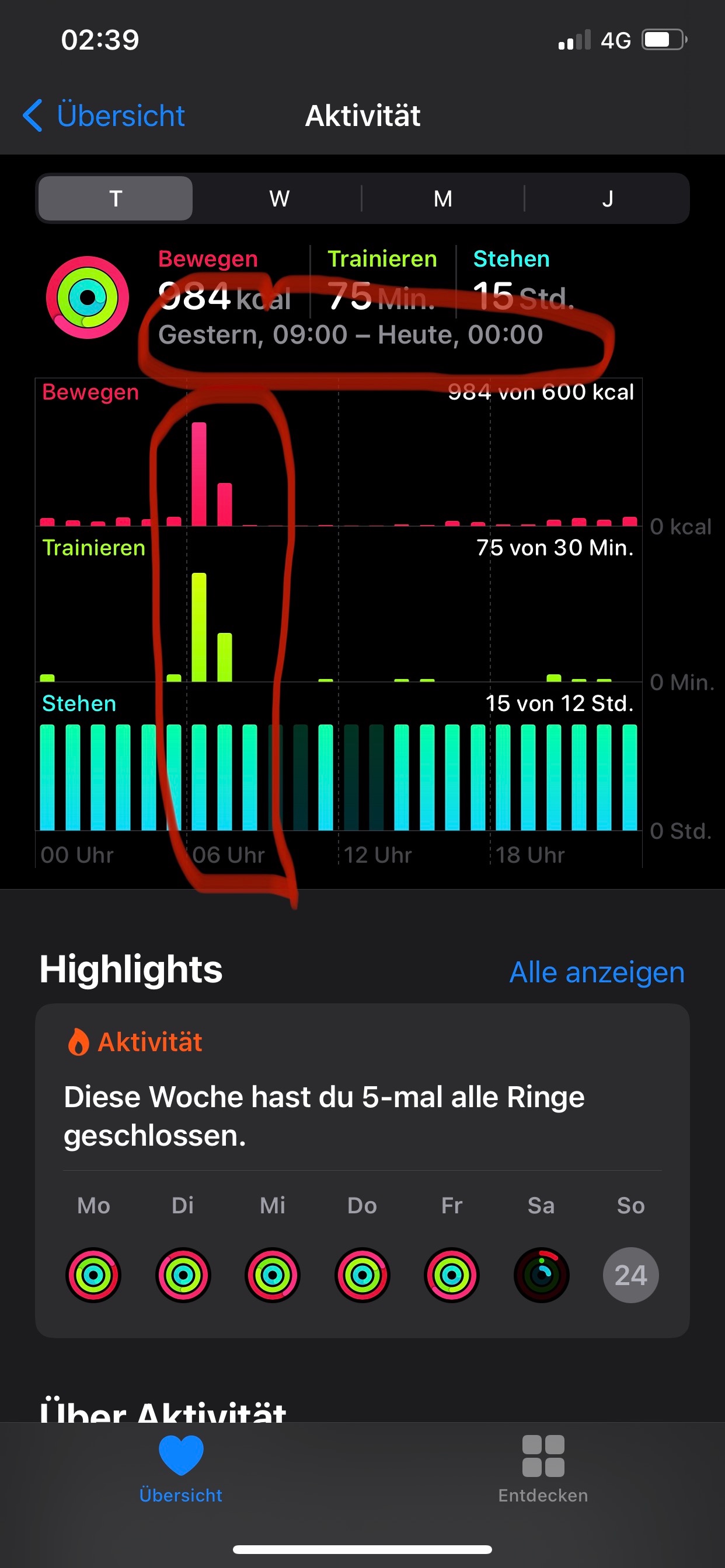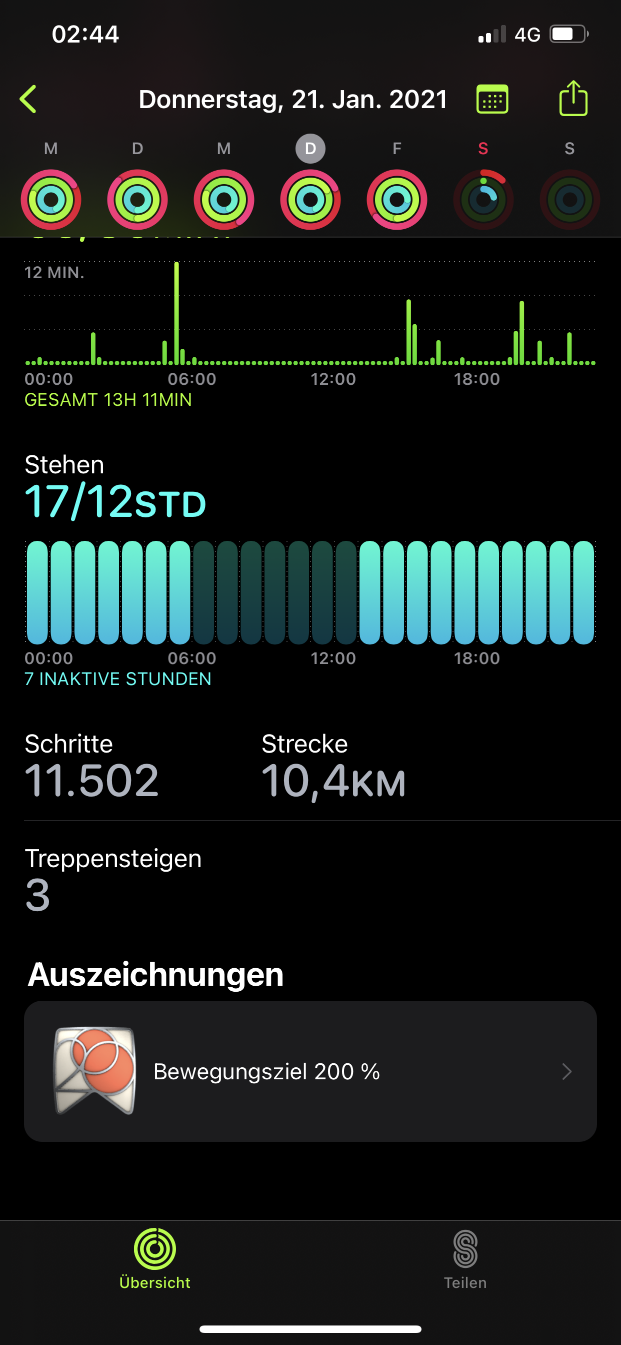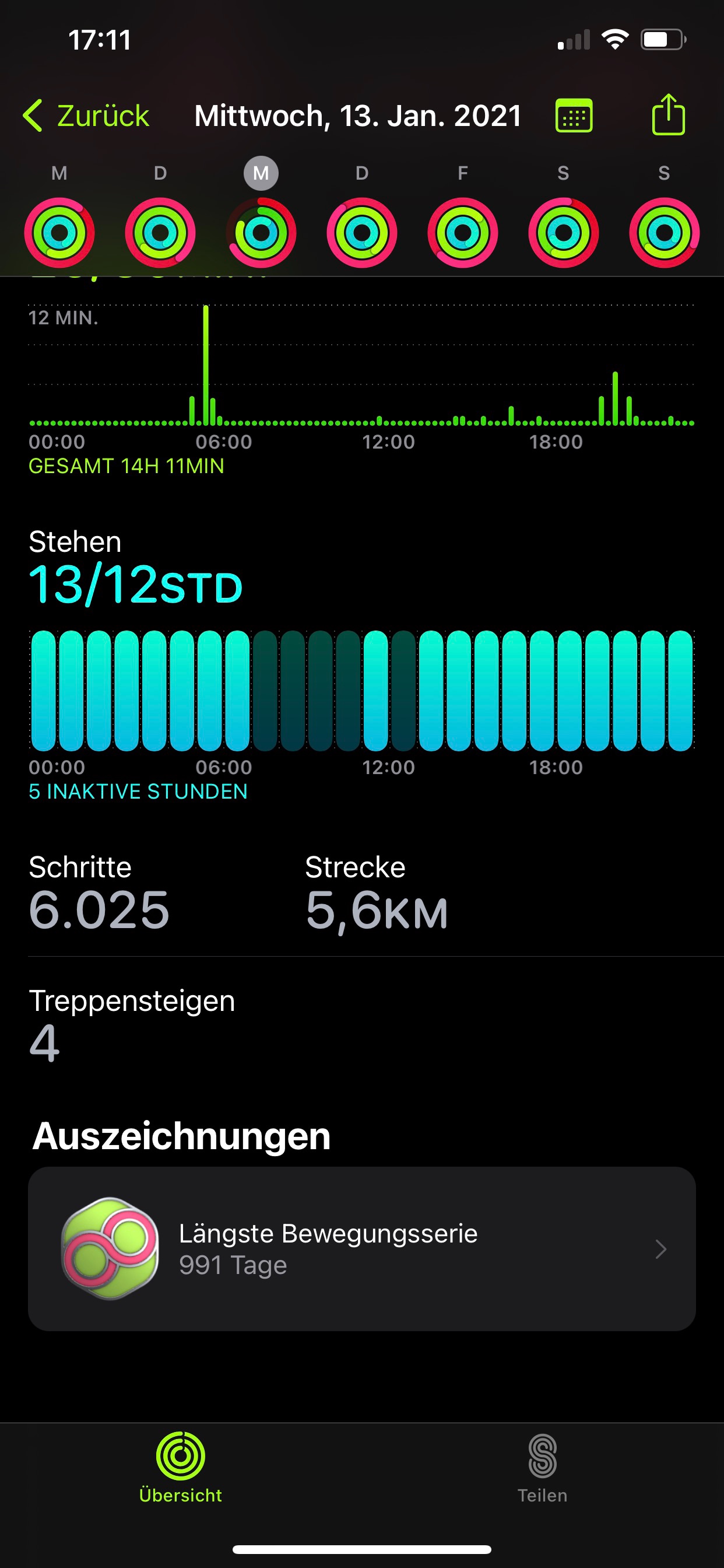 leider riss meine aktuelle Bewegungsserie von fast 1000 Tagen noch bevor ich die 1000 voll machen konnte. Am Mittwoch bekam ich meine neue Apple Watch ( Series 6 ), entkoppeln - Backup - neue Watch koppeln, alles kein Problem, auch die Aktivitäten wurden sofort übernommen und wurden von der neuen Watch weitergezählt...dachte ich...Auf den angehefteten Screenshots ( vor allem an den Stehstunden ) kann man erkennen dass die Fitness und Health App zwar beide Watches aufzeichnete aber nur meine alte Watch zählte. Auch erkennt man in der Health App bei Aktivitätskalorien dass ich an diesem Tag mein Ziel von 600 schaffte. iPhone und Appel Watch wurden schon mehrmals neu gestartet, leider ohne Erfolg.