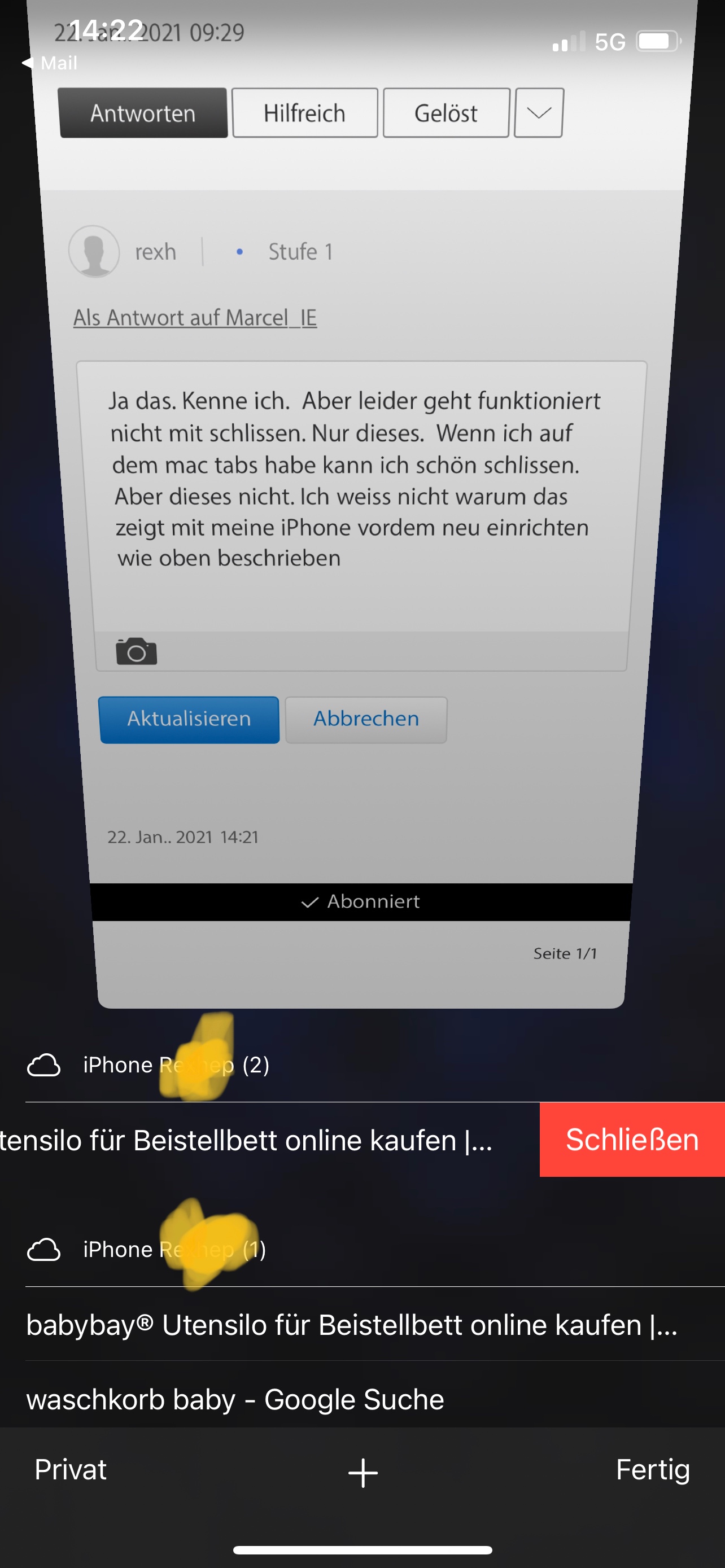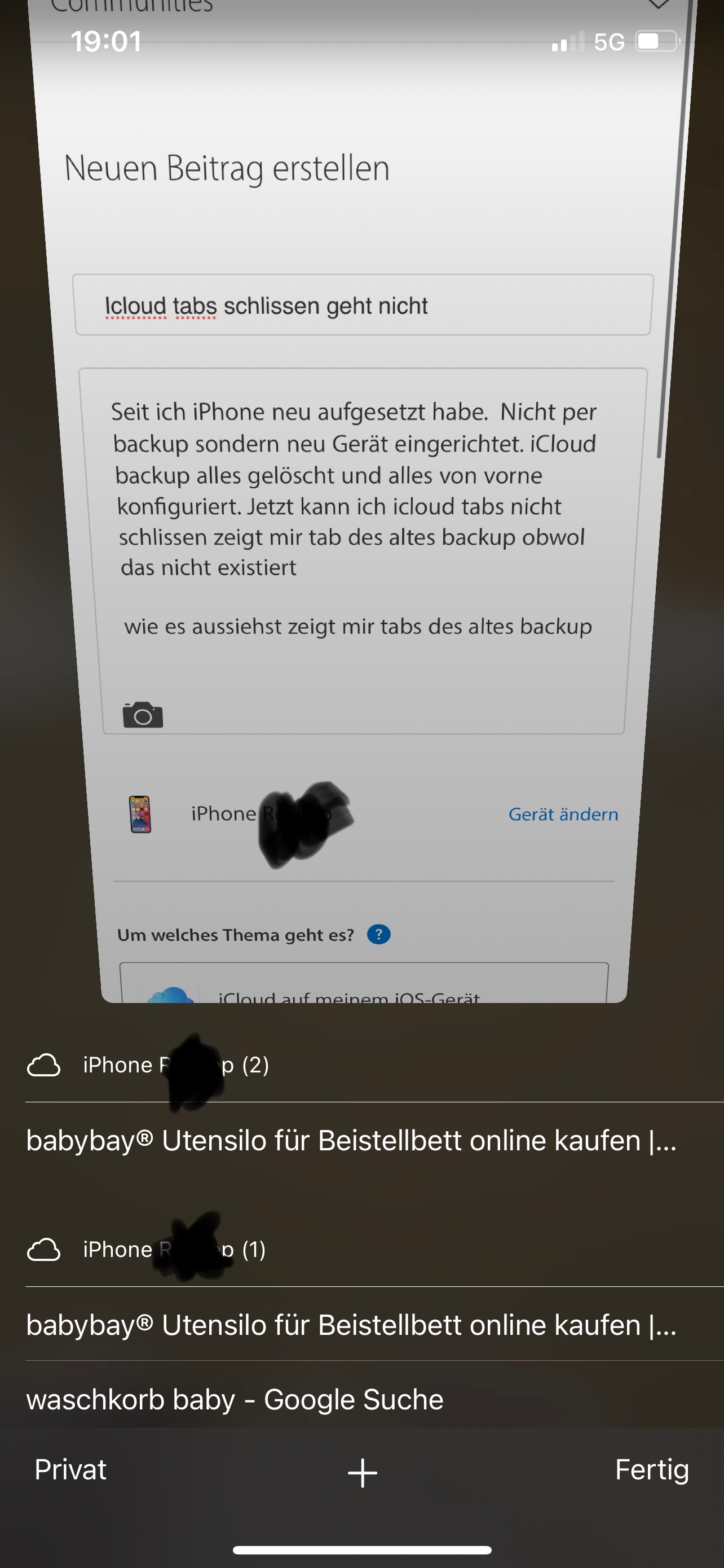 Seit ich iPhone neu aufgesetzt habe. Nicht per backup sondern neu Gerät eingerichtet. iCloud backup alles gelöscht und alles von vorne konfiguriert. Jetzt kann ich icloud tabs nicht schlissen zeigt mir tab des altes backup obwol das nicht existiert