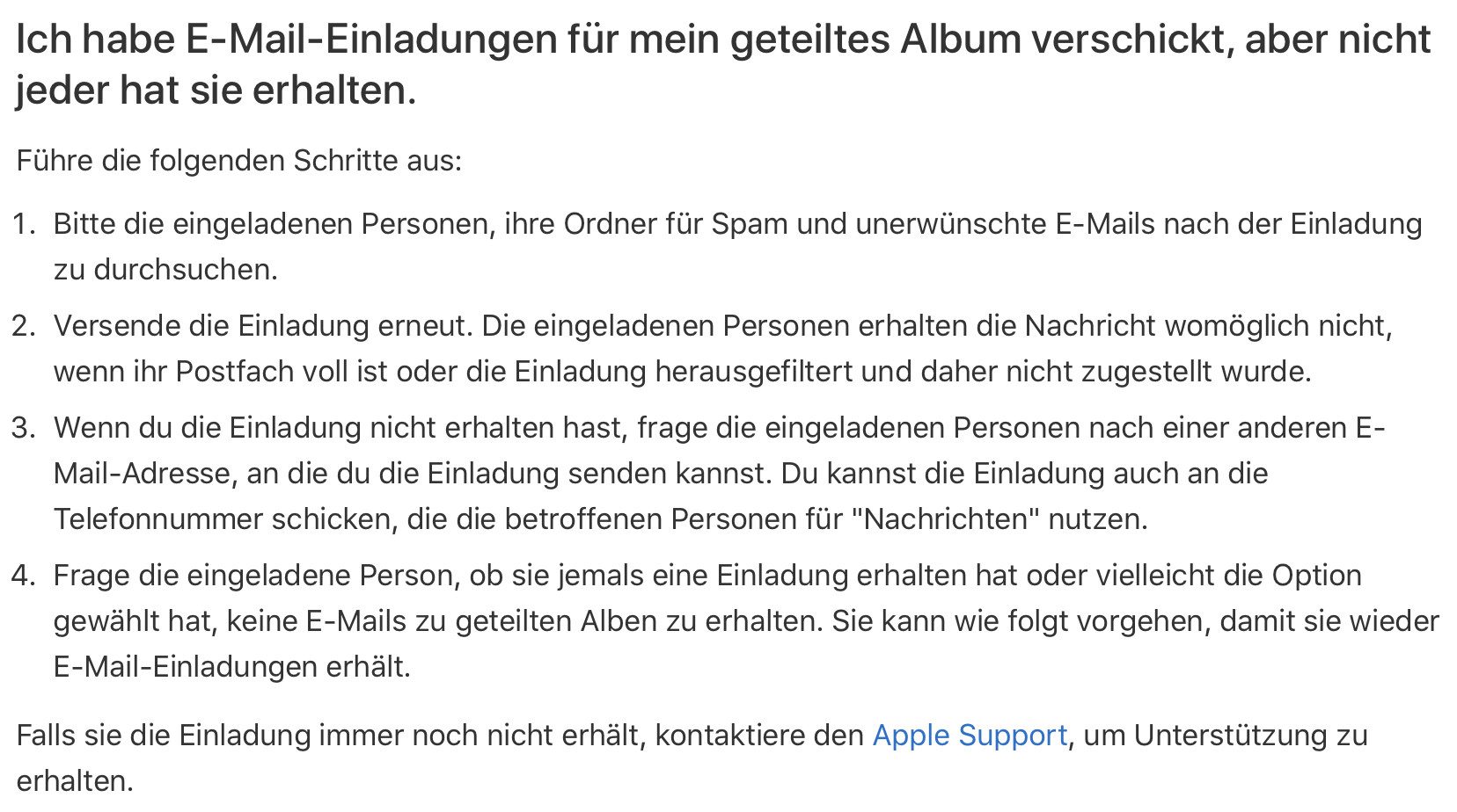 ich habe seit einigen Wochen das Problem, dass meine Einladungen zu einem Foto Album nicht ankommen. Weder wenn ich diese von meinem iPhone versende, noch von meinem Mac.