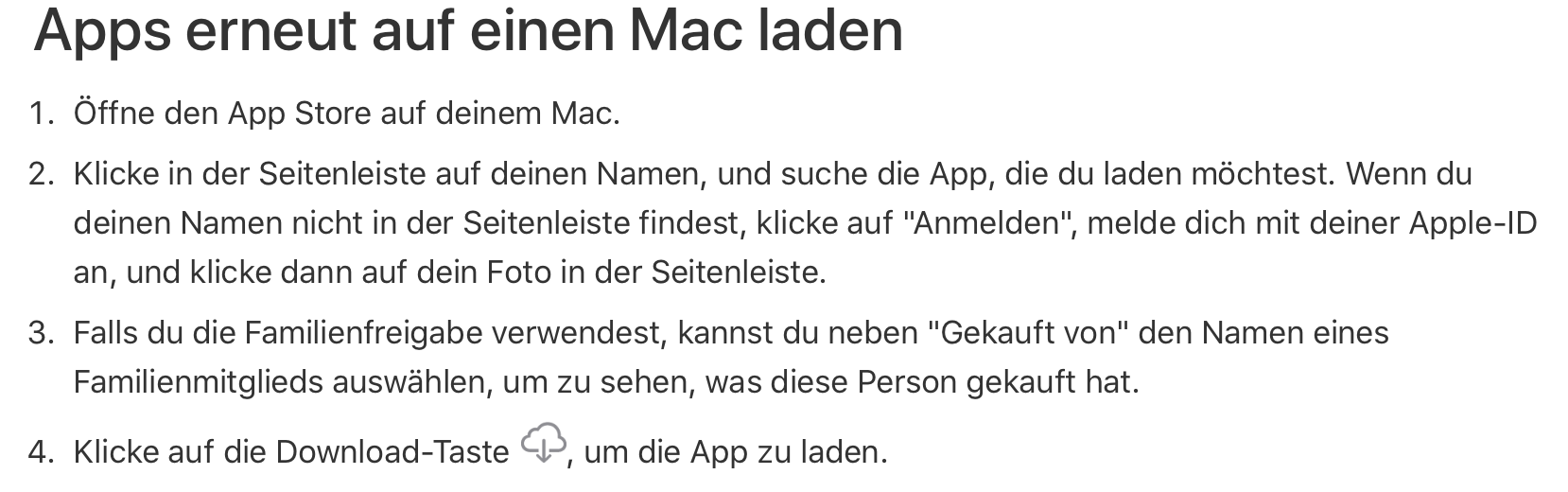 schaue dir dazu einmal den folgenden Support Artikel an und gehe auf dem Mac wie folgt vor: Apps und Spiele erneut von Apple laden