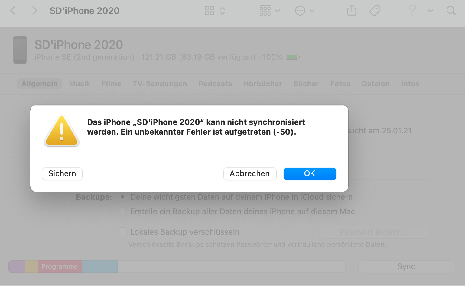 Wenn ich mein iPhone SE 2020 mit dem USB-Kabel oder mit dem WLAN mit meinem Mac Book (Big Sur) synchronisieren möchte, erscheint jeweils eine Fehlermeldung und der Vorgang wird abgebrochen. Was ist die Ursache und wie kann ich es beheben?