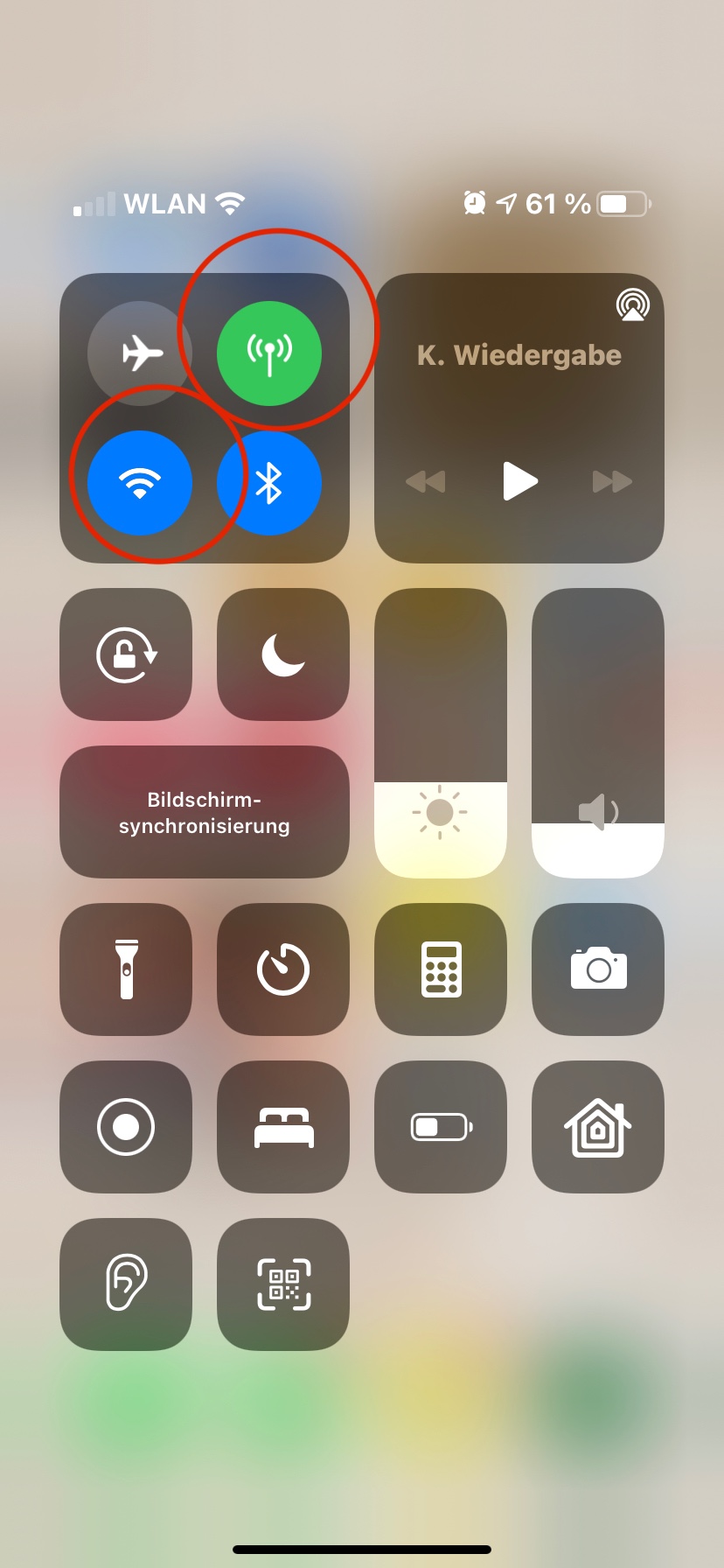 Um die WLAN Verbindung temporär zu trennen, öffne zunächst das Kontrollzentrum, indem du vom unteren Bildschirmrand nach oben wischst und dann auf das blaue WLAN Symbol und das grüne "Funkmast"-Symbol tippst, wie im Screenshot unten gezeigt: