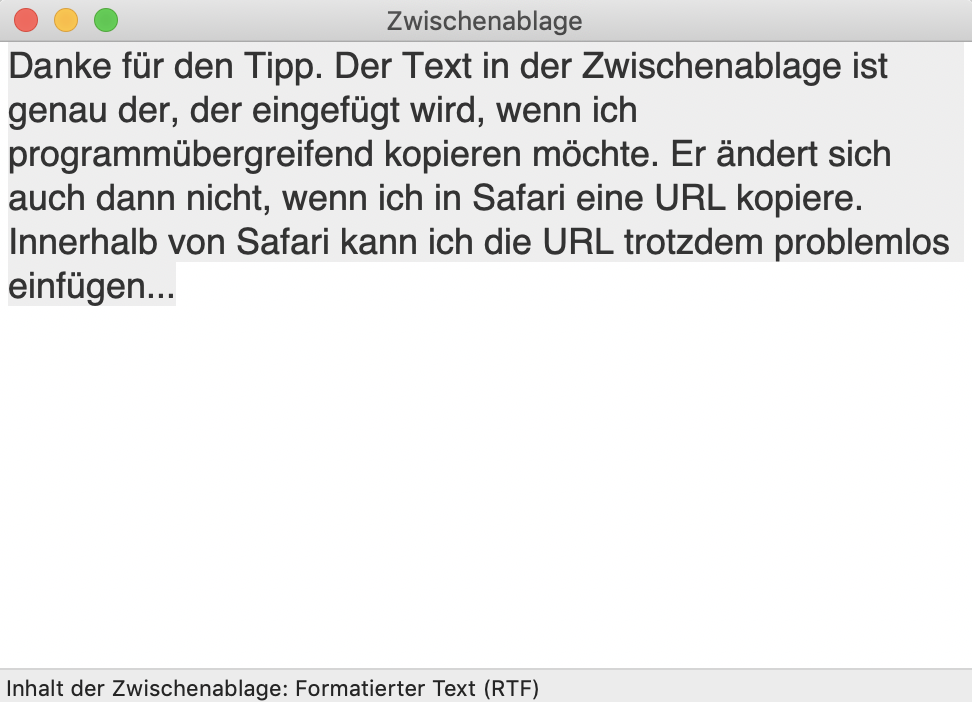 Ich dachte zunächst, dass es an einem ausstehenden MO Update liegt. Aber das Problem betrifft alle Programme. Also es funktioniert auch nicht richtig, wenn ich von Safari in Notizen oder vice versa kopieren möchte.
