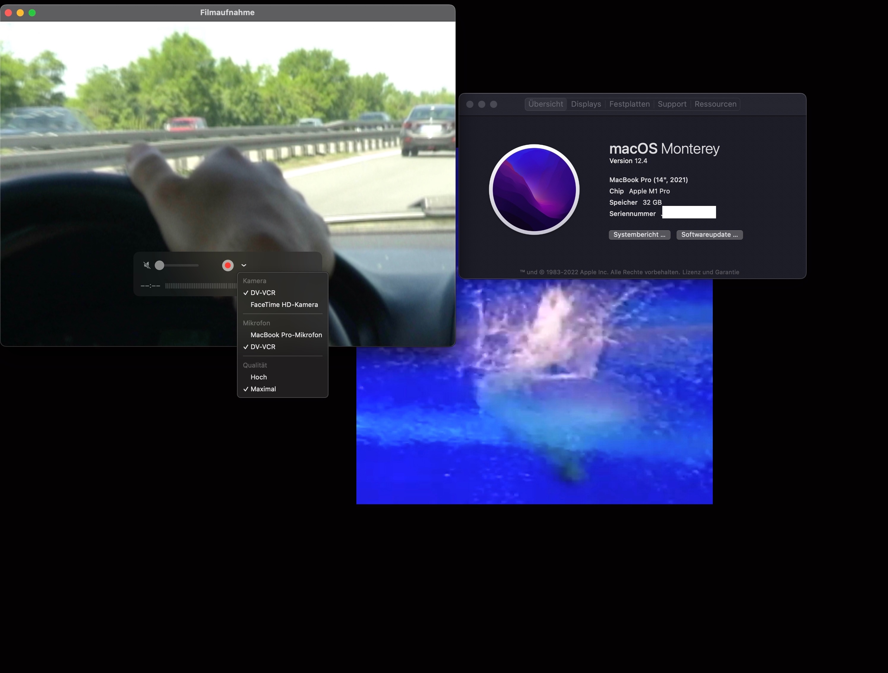 Ich habe mir vor kurzem einen MiniDV-Camcorder (Sony trv900) geholt und möchte gefilmte clips auf mein MacBook Pro 2020 (Version 11.1) importieren. Mit Imovie hat das nicht geklappt also hab ich nach langer Recherche ein Programm gefunden, welches MiniDv problemlos importiert, namens LifeFlix DV Importer. Ich habe meine Kamera mit einem FireWire verbunden welchen ich mit einem Apple Adapter auf Thunderbolt verbunden hab den ich nochmals mit einem Thunderbolt auf usb-C verbunden habe. (So wurde mir übers Internet gesagt funktioniert es).
