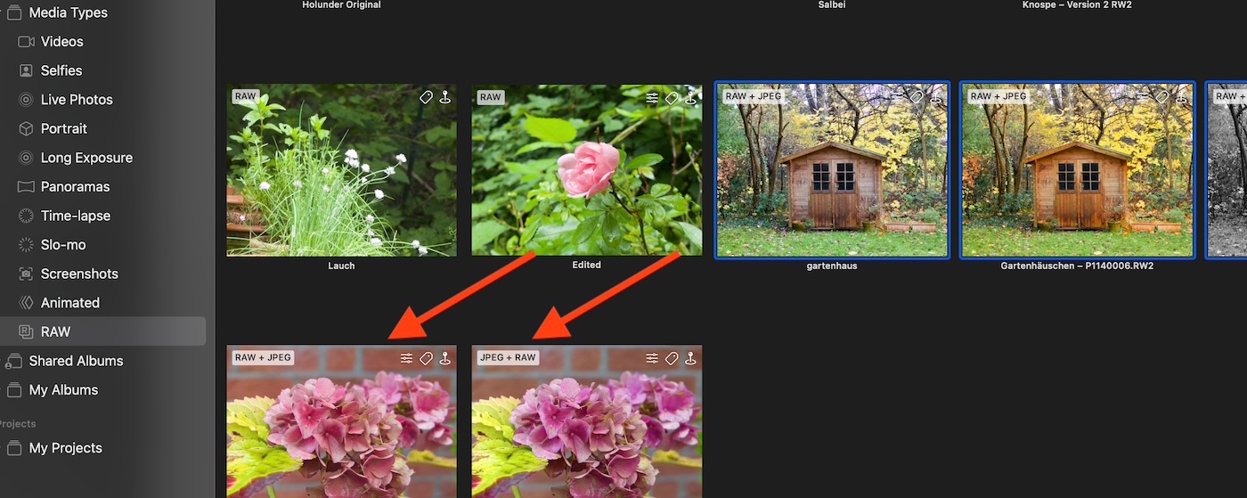 Ich habe Fotos in LF + RAW aufgenommen, die SD-Karte im Mac eingelesen sowie unter "Fotos" abgespeichert. Bei dem Aufrufen der Fotos erscheint aber nur ein Foto mit einem kleinen weißen Feld rechts oben, in dem ein J steht. Darunter ist eine zweite Datei gestapelt, bei der es sich vermutlich um die RAW-Version des Fotos handelt. Wie kann ich diese RAW-Version aufrufen? Und mit welchen Tastenklicks kann ich beide Versionen (JPEG und RAW) in Fotos anzeigen.