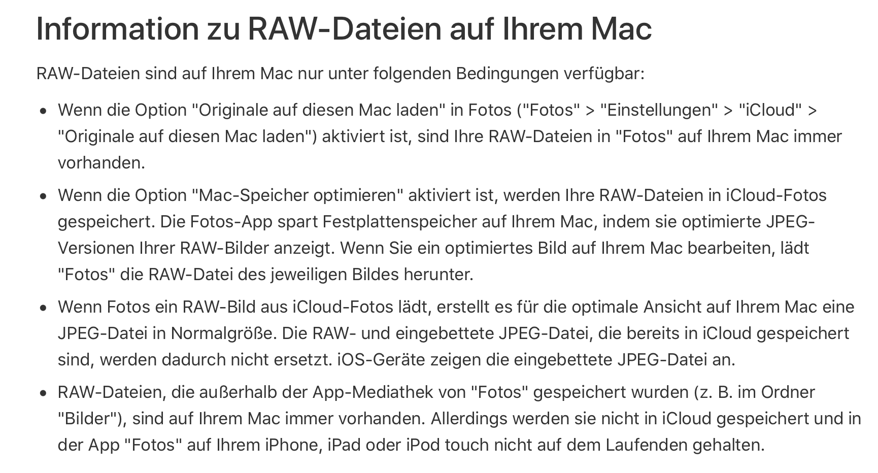 In der letzten Punkt-Auflistung sollen ja angeblich RAW-Dateien, die in "Fotos" gespeichert werden, immer auf dem Mac vorhanden sein. Aber wo sind sie und wie rufe ich sie auf? Irgendwie komme ich nicht weiter.