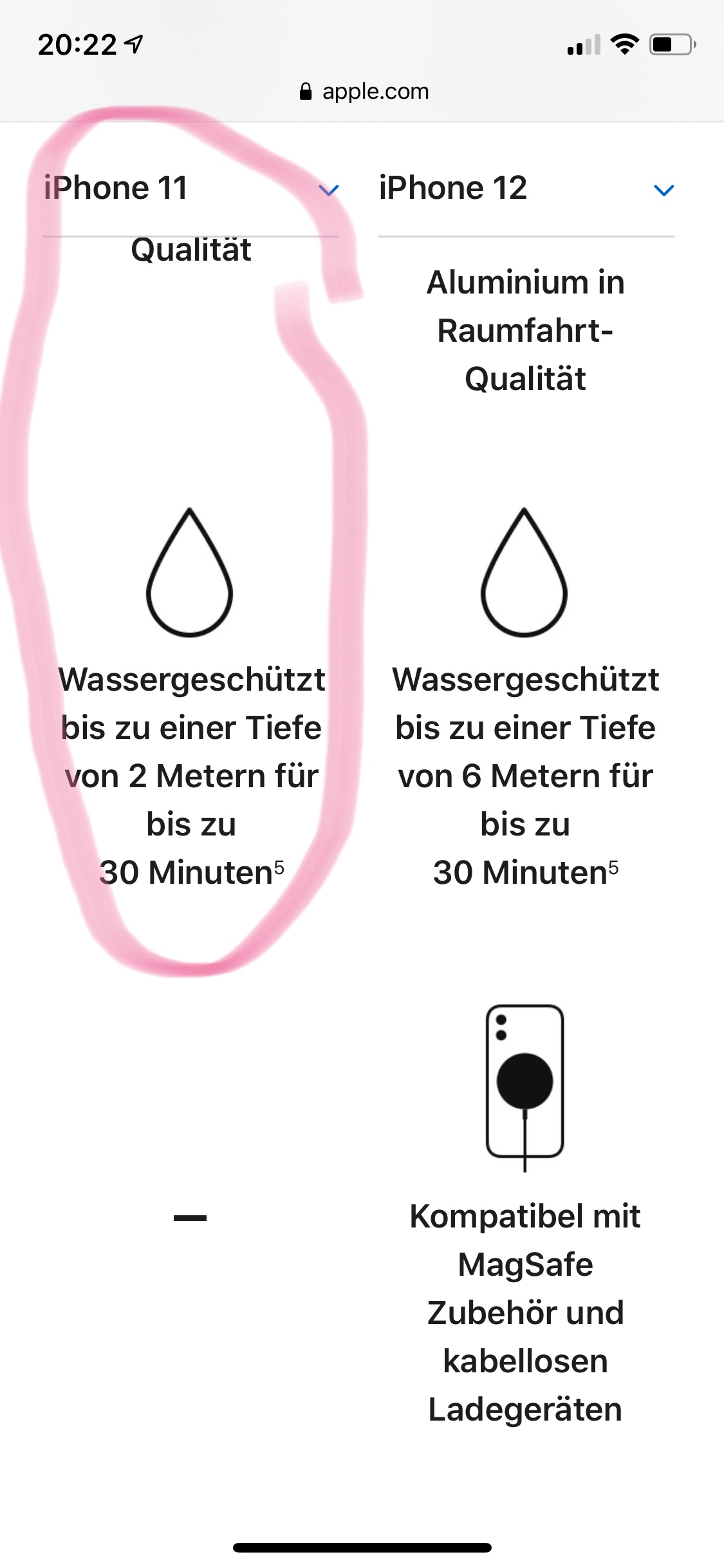 Phone 7, iPhone 7 Plus, iPhone 8, iPhone 8 Plus, iPhone X, iPhone XS, iPhone XS Max, iPhone XR, iPhone SE (2. Generation), iPhone 11 Pro, iPhone 11 Pro Max, iPhone 11, iPhone 12 Pro, iPhone 12 Pro Max, iPhone 12 und iPhone 12 mini sind vor Wasser und Staub geschützt und wurden unter kontrollierten Laborbedingungen getestet. iPhone 12 Pro, iPhone 12 Pro Max, iPhone 12 und iPhone 12 mini sind nach IEC Norm 60529 unter IP68 klassifiziert (bis zu 6 Meter für bis zu 30 Minuten), iPhone 11 Pro und iPhone 11 Pro Max sind nach IEC Norm 60529 unter IP68 klassifiziert (bis zu 4 Meter für bis zu 30 Minuten), iPhone XS, iPhone XS Max und iPhone 11 sind nach IEC Norm 60529 unter IP68 klassifiziert (bis zu 2 Meter für bis zu 30 Minuten) und iPhone 7, iPhone 7 Plus, iPhone 8, iPhone 8 Plus, iPhone X, iPhone XR und iPhone SE (2. Generation) sind nach IEC Norm 60529 unter IP67 klassifiziert (bis zu 1 Meter für bis zu 30 Minuten). Der Schutz vor Wasser und Staub ist nicht dauerhaft und kann mit der Zeit als Resultat von normaler Abnutzung geringer werden. Ein nasses iPhone darf nicht geladen werden. Im Benutzerhandbuch befindet sich eine Anleitung zum Reinigen und Trocknen. Die Garantie deckt keine Schäden durch Flüssigkeiten ab.