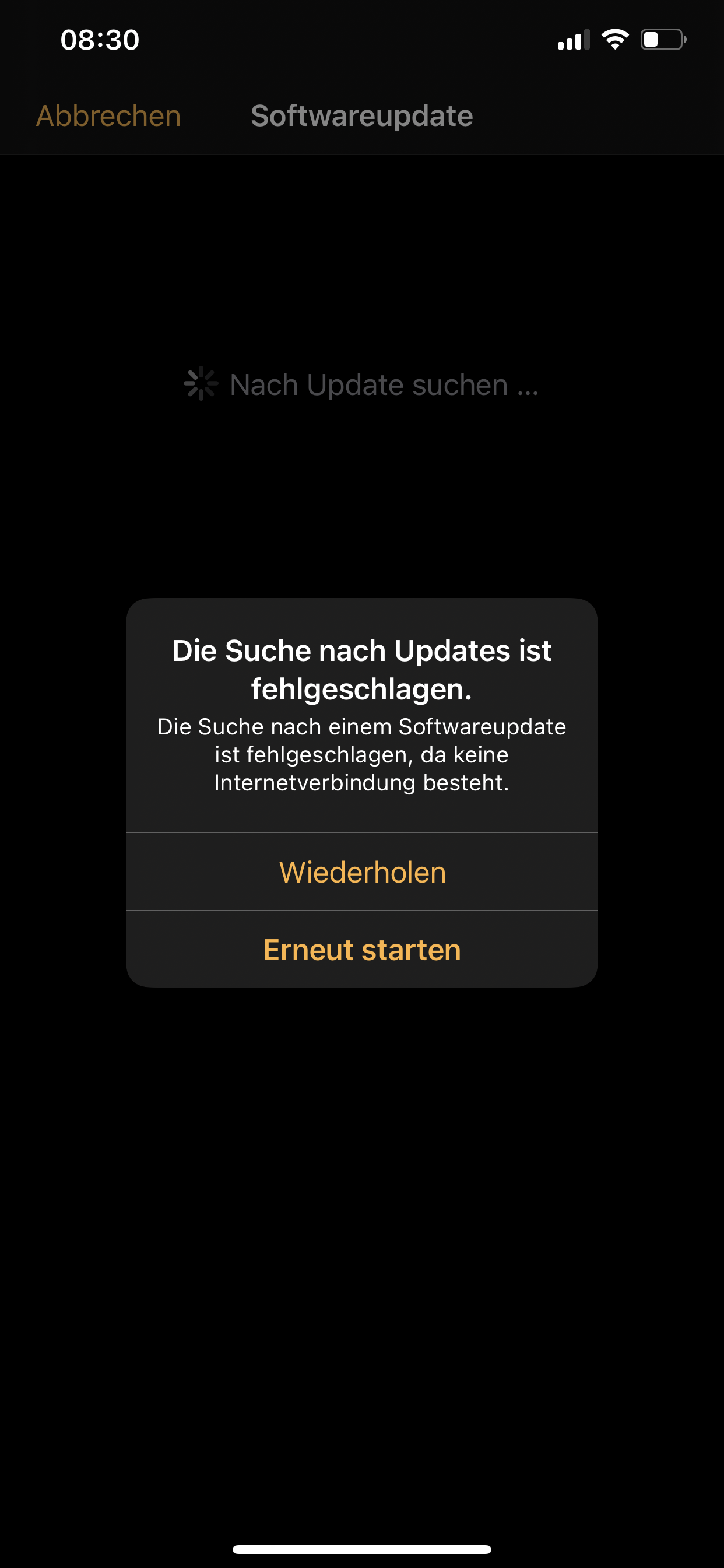 anbei versuche ich meine Apple Watch mit meinem neuen Handy zu konfigurieren. Die App fordert das ich den Softwareupdate aktualisiere, die ich auch versucht habe und anschließend bekomme ich die Nachricht „Die suche nach Updates ist fehlgeschlagen“ und somit kann ich nicht weiter konfigurieren. Wie kann ich dieses Problem beheben?