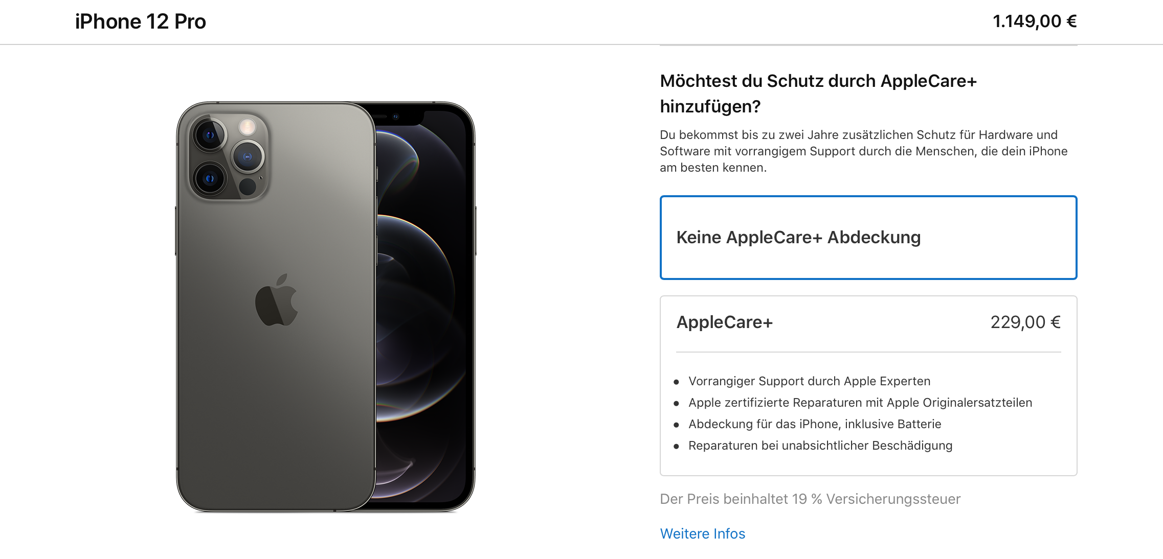 Apple Care wird bei Kauf von iPhone 12 Pro nicht angeboten