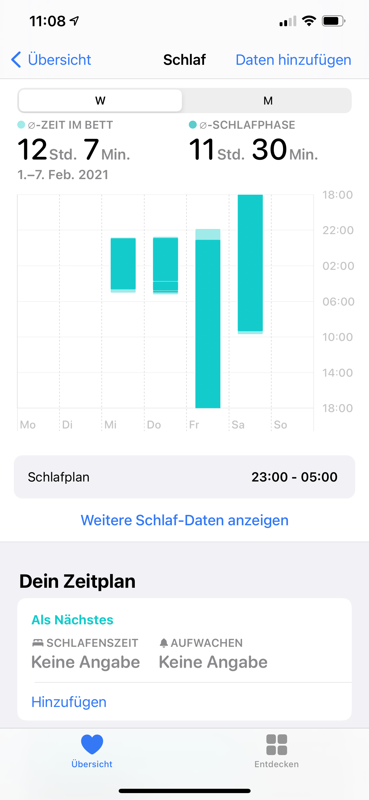 Ich Lege momentan großen Wert auf Gesundheit und speziell um einen gesunden Schlaf. Unter anderem habe ich mir aus diesem Grund eine Apple Watch zu gelegt. Unter der Woche habe ich einen Schlafplan eingerichtet, welcher auch sehr gut funktioniert und meine Daten plausibel aufzeichnet. Am Wochenende brauche ich das nicht.