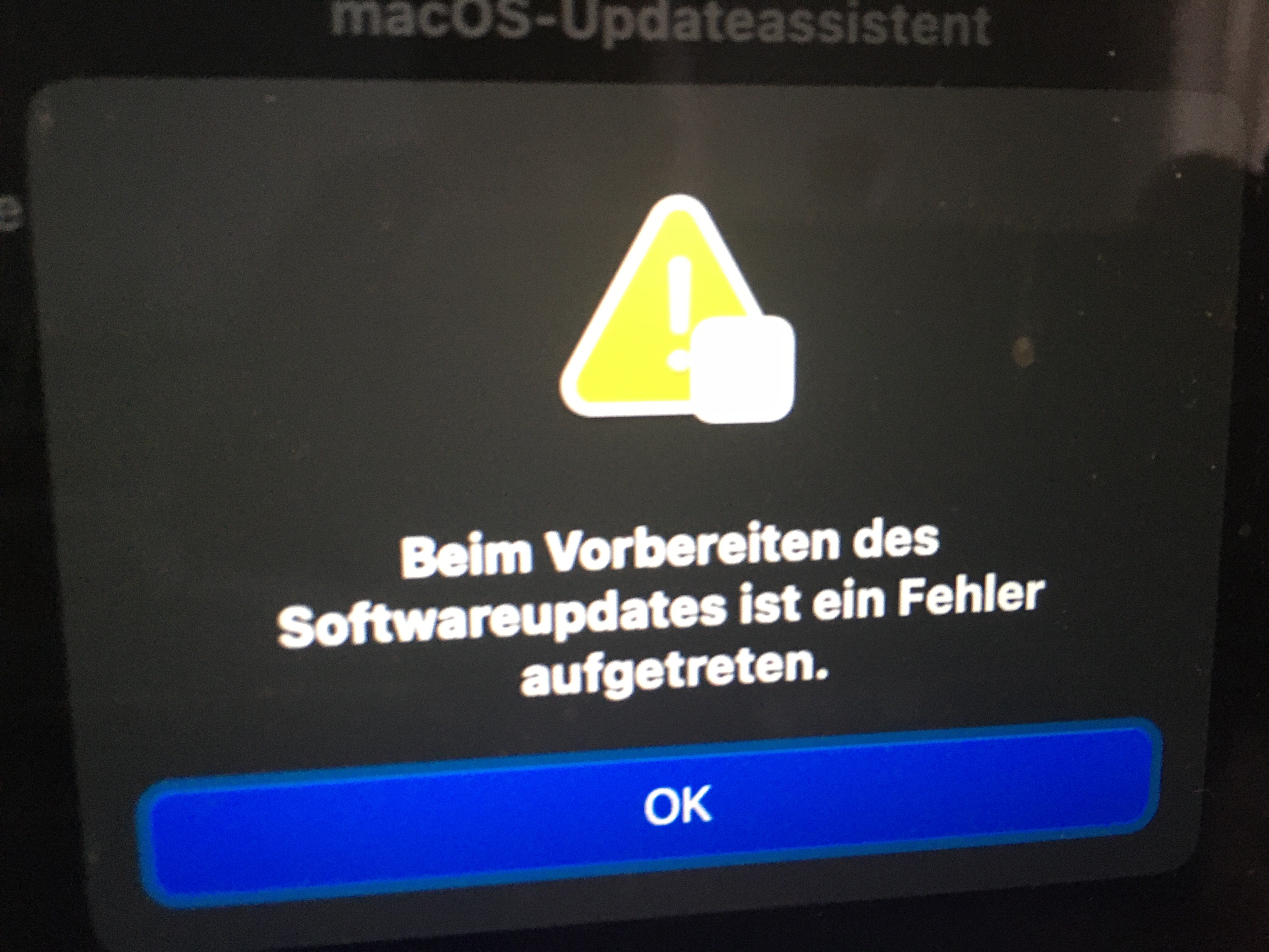 Nach dem (ca 20 min dauernden) Neustart bei der Big Sur Installation, erscheint auf meinem MacBookPro die Meldung „Beim Vorbereiten des Softwareupdates ist ein Fehler aufgetreten“.