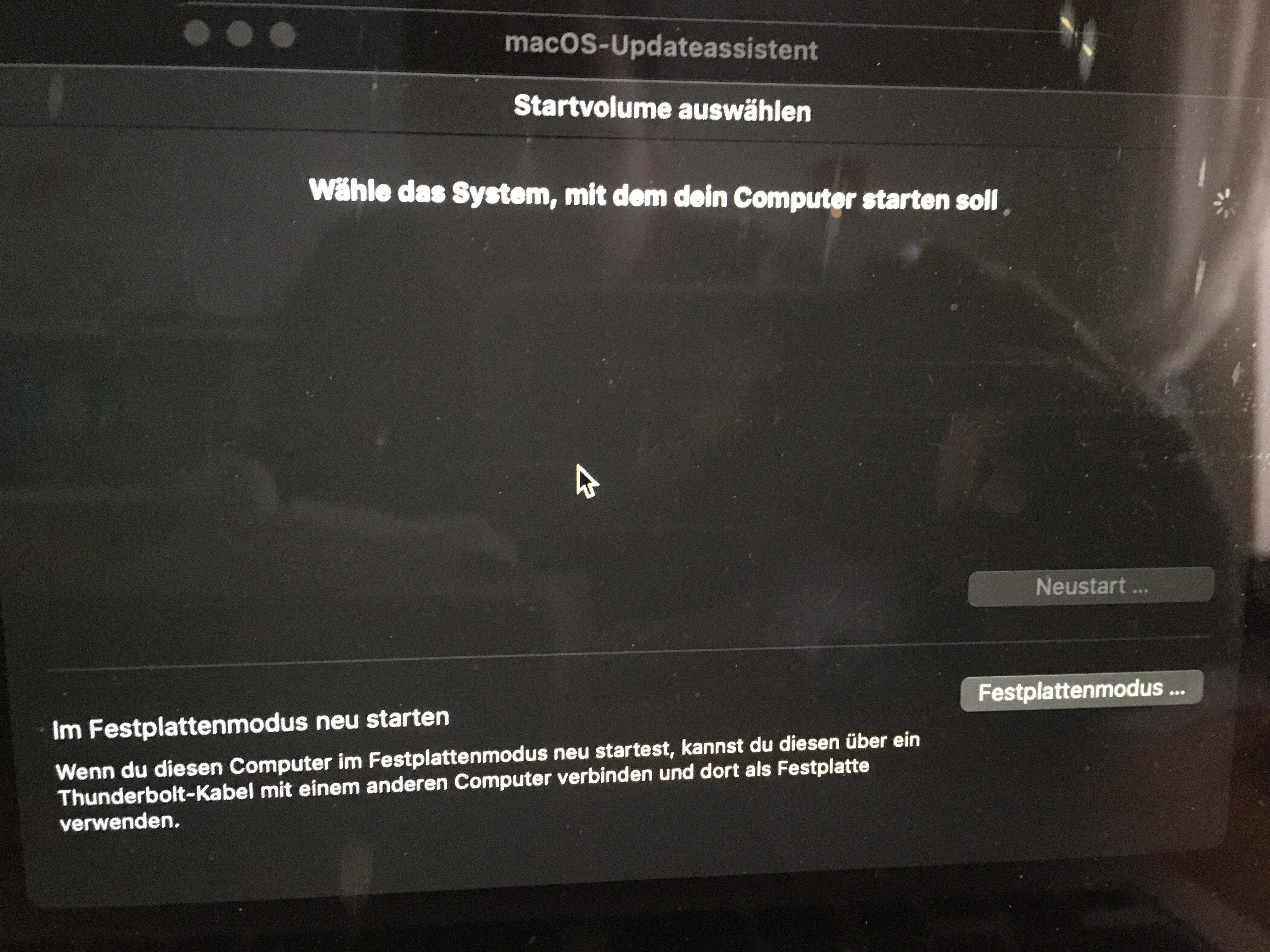 Wenn ich auf ok klicke, erscheint der macOS-Updateassistent mit „Startvolume auswählen“. Die einzige Option hier ist allerdings „Im Festplattenmodus starten“. Ansonsten steht mir nur Ausschalten und Neustart zur Verfügung. Wenn ich Neustarte geht das Spiel allerdings lediglich von vorne los (20min warten + Fehlermeldung).