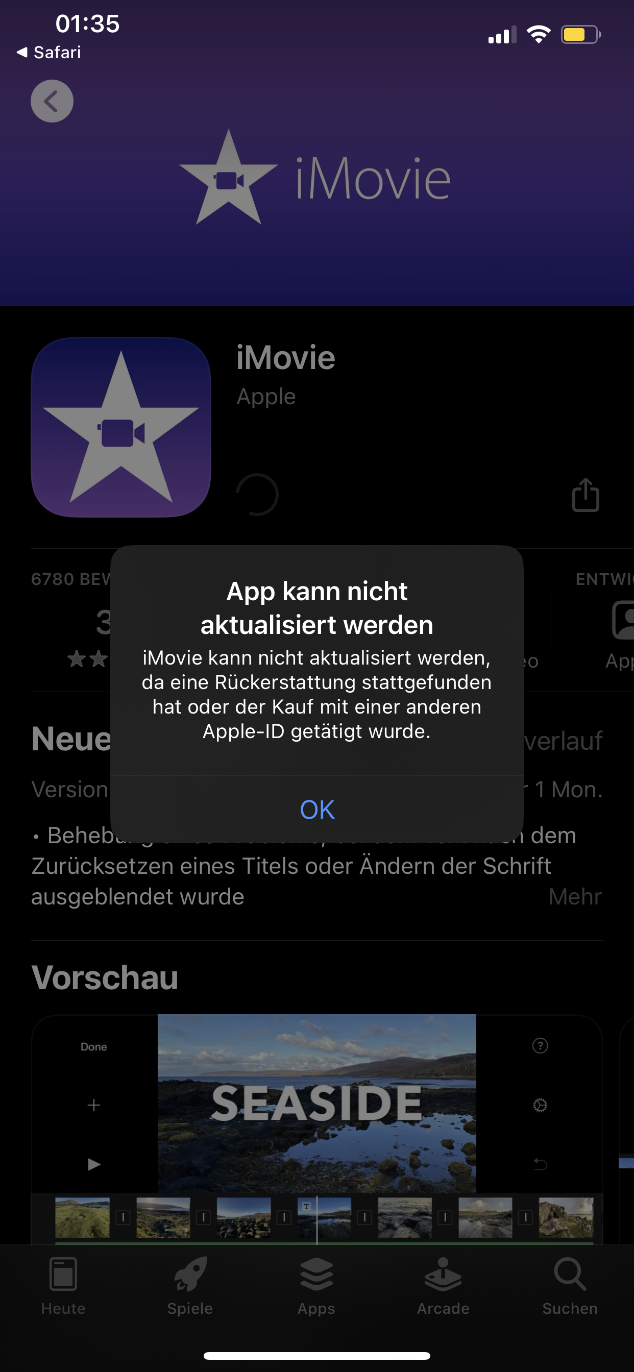 Guten Abend, ich wollte die App iMovie runterladen bzw aktualisieren doch dort steht Kann nicht aktualisiert werden da eine Rückerstattung stattgefunden hat Oder Ein kauf mit einem anderen Gerät. Was kann ich tun damit ich es trotzdem aktualisieren kann.
