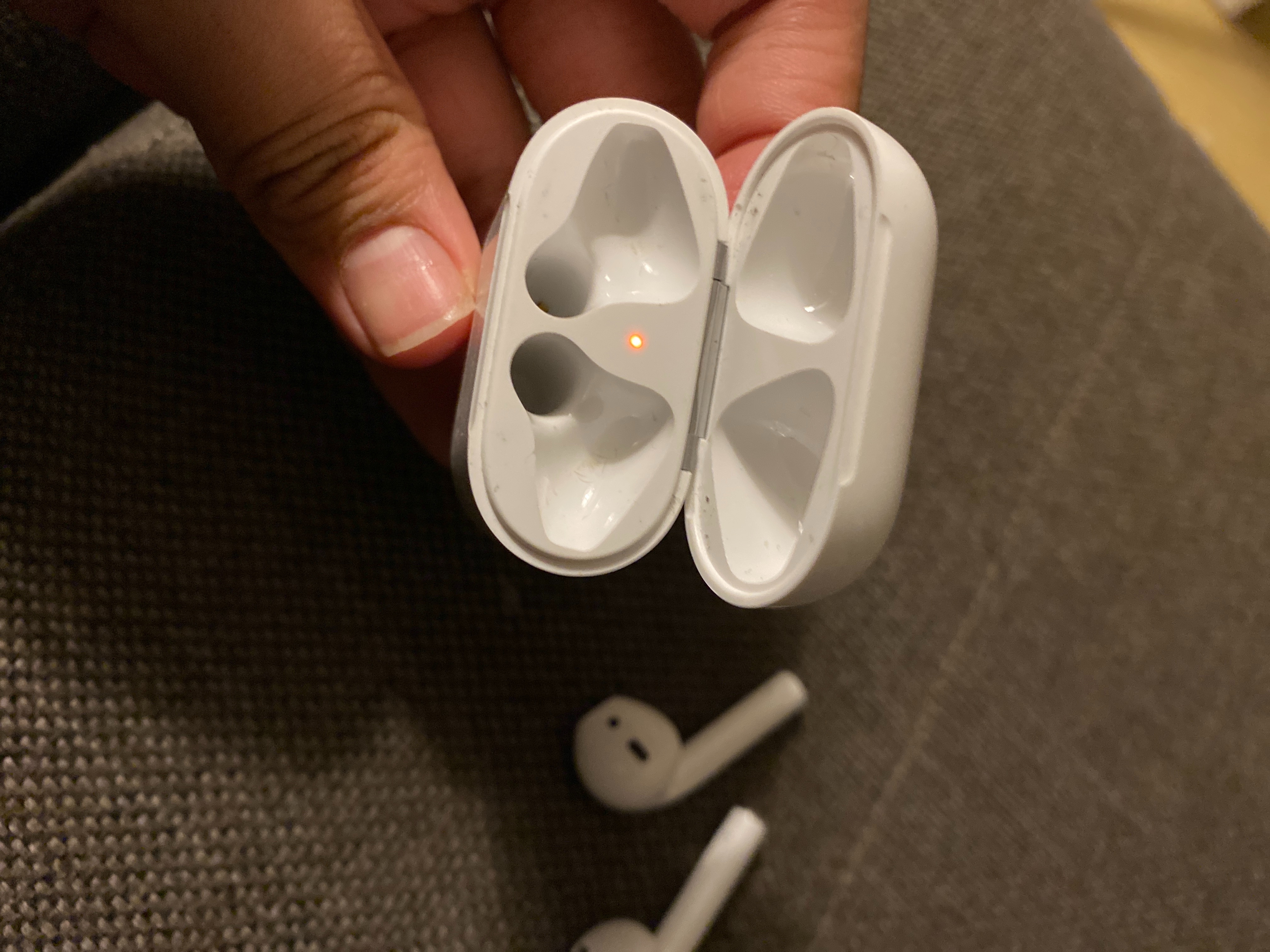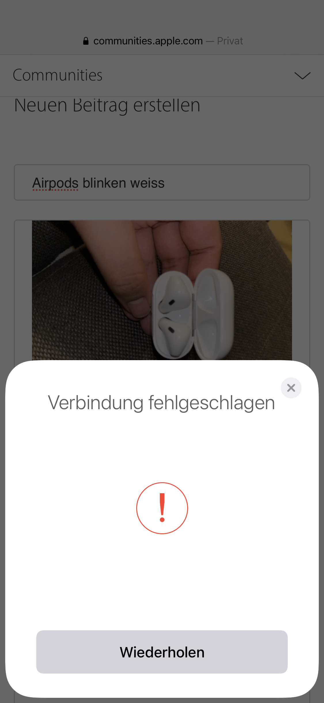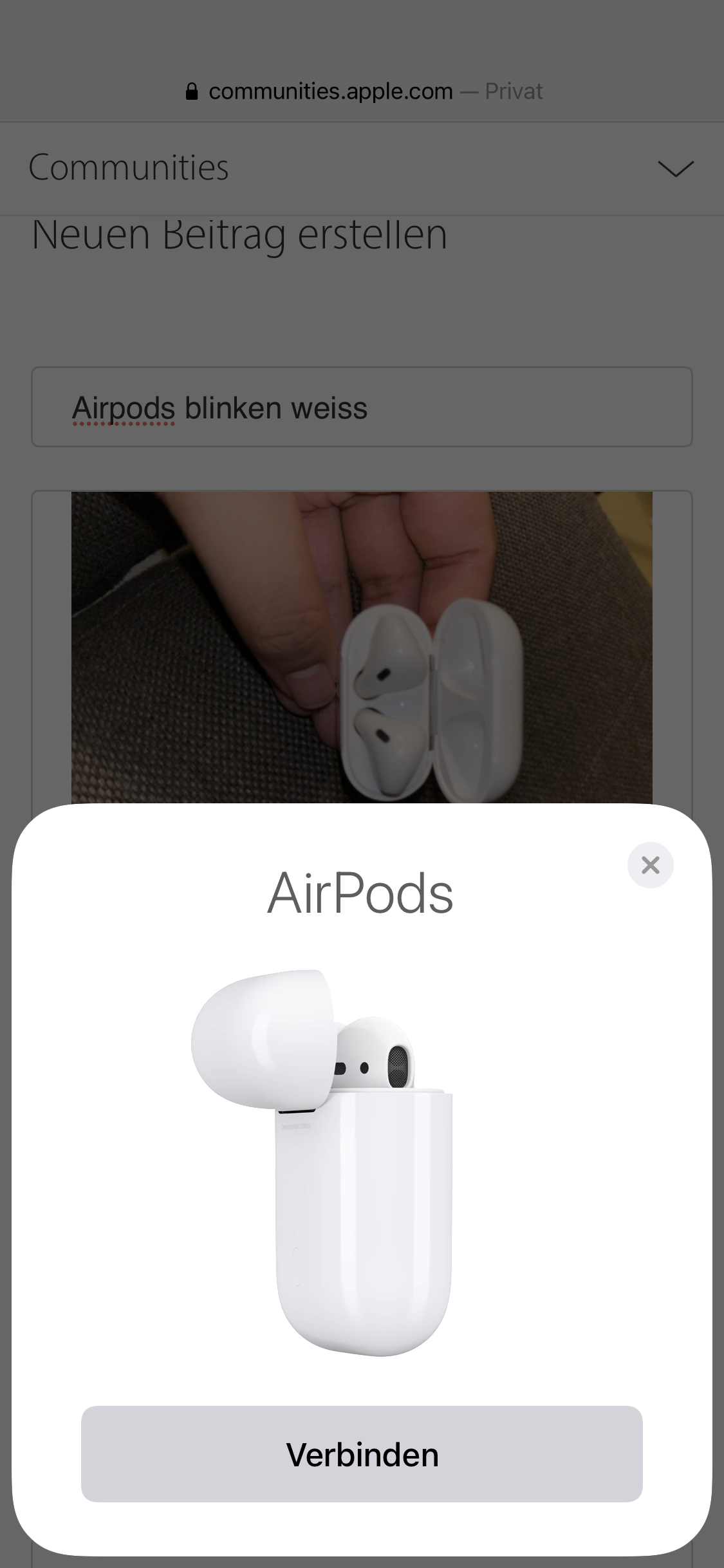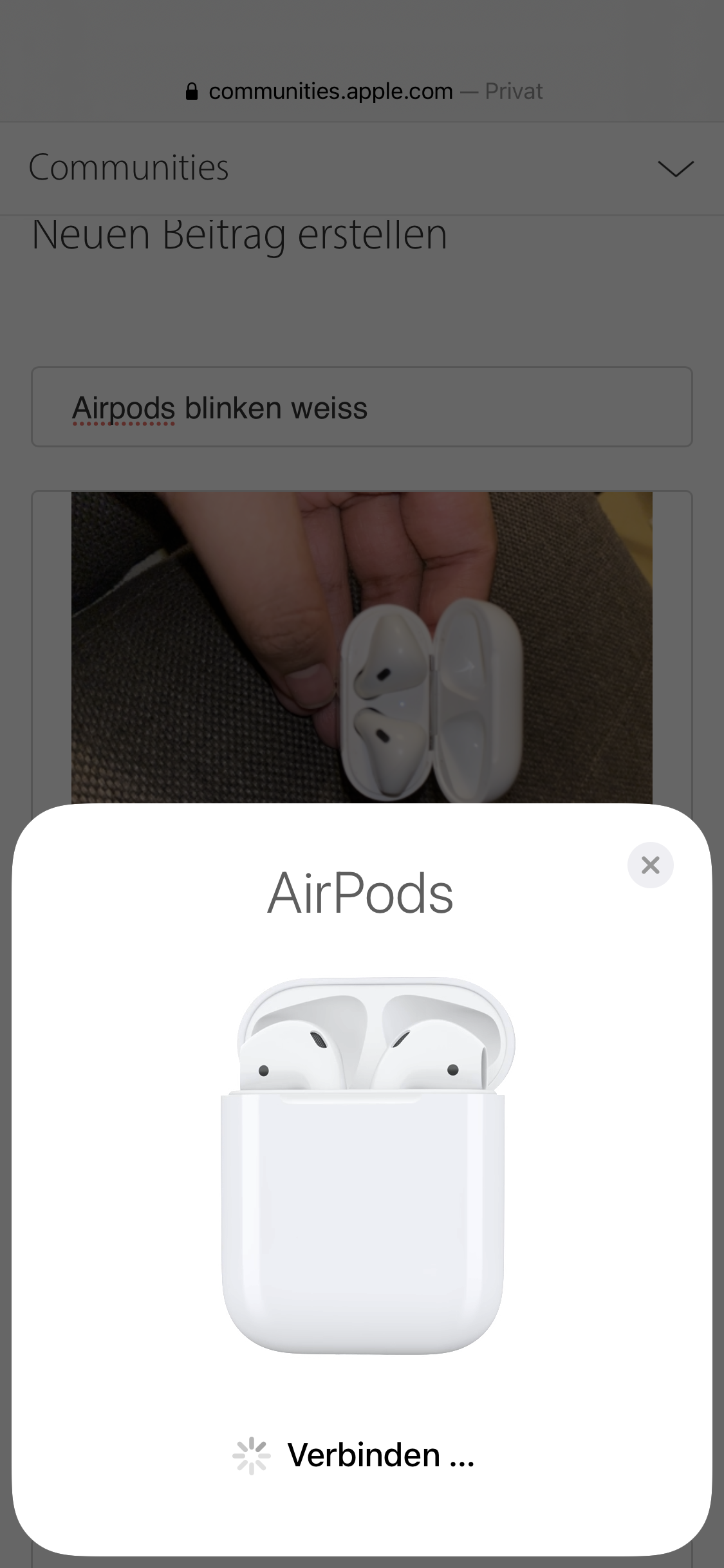 Meine Airpods 1 blinken leider dauerhaft weiß. Es wird angezeigt, dass es Airpods in der Umgebung gibt. Drückt man aber auf Verbinden, so erscheint nach einem Ladeprozess ein rotes Ausrufezeichen.