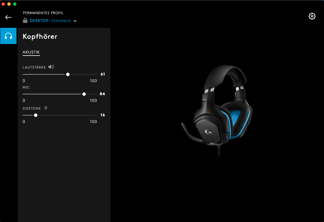 ich habe mir das Logitech G432 Headset gekauft, da es ein 7.1 Surround Sound System besitzt. Dazu habe ich mir die Software "Logitech G HUB", für macOS heruntergeladen. Dort kann man auswählen, ob man Stereo oder Surround Sound haben will. Allerdings erscheint bei mir der Punkt, bei dem ich den Surround Sound anschalten kann nicht. Dieser müsste neben der Schaltfläche "Akustik" erscheinen (siehe Bild).