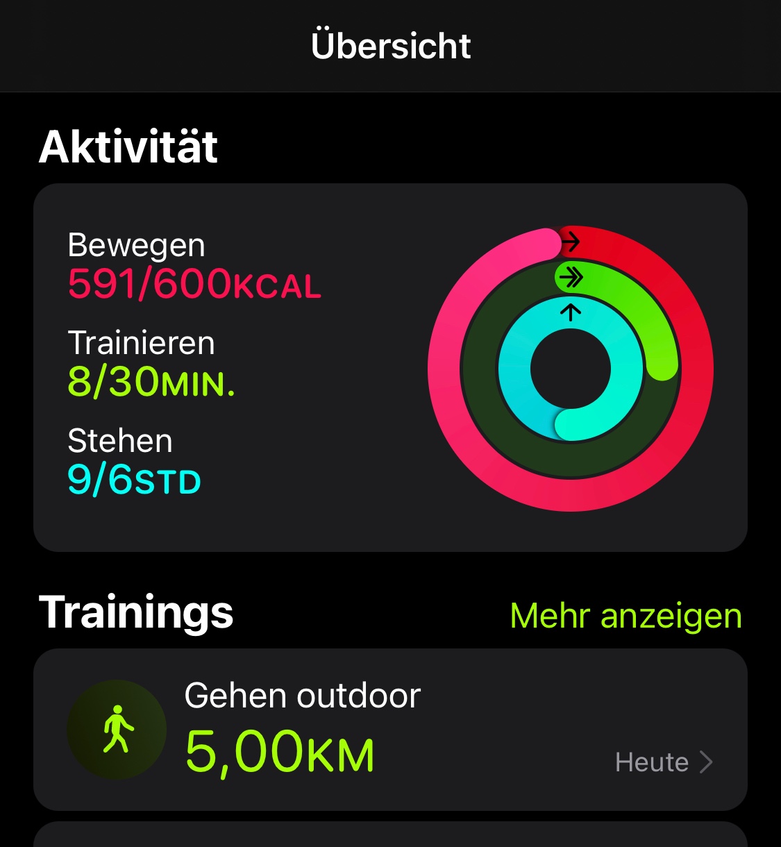 Meine Trainings werden von der Watch, Neueste Version, aktuellstes Betriebssystem, an die Fitness/Activity App gesendet, und sind auch auf dem Iphone 11Pro, IOS 14.4, sichtbar. Aber die Ringe schliessen sich nicht. Restarts und Entkoppeln hilft nicht.