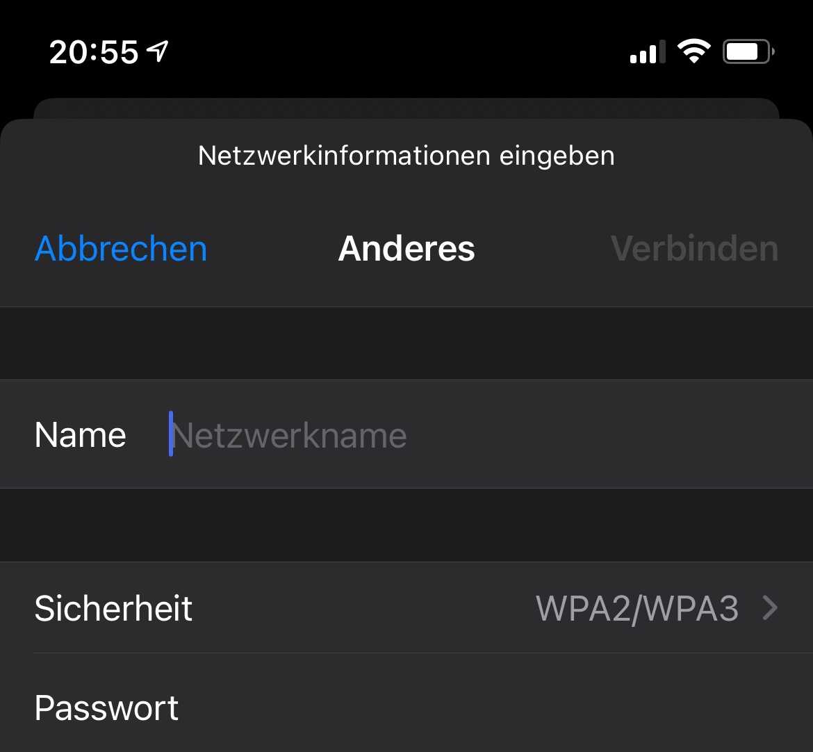 Du kannst auch versuchen dein WLAN manuell hinzuzufügen. Gehe dafür auf „Anderes“ unter Einstellungen -> WLAN. Dort gibst du den exakten Namen des WLANs ein und das Passwort. Wähle WPA2 (Siehe Screenshots).
