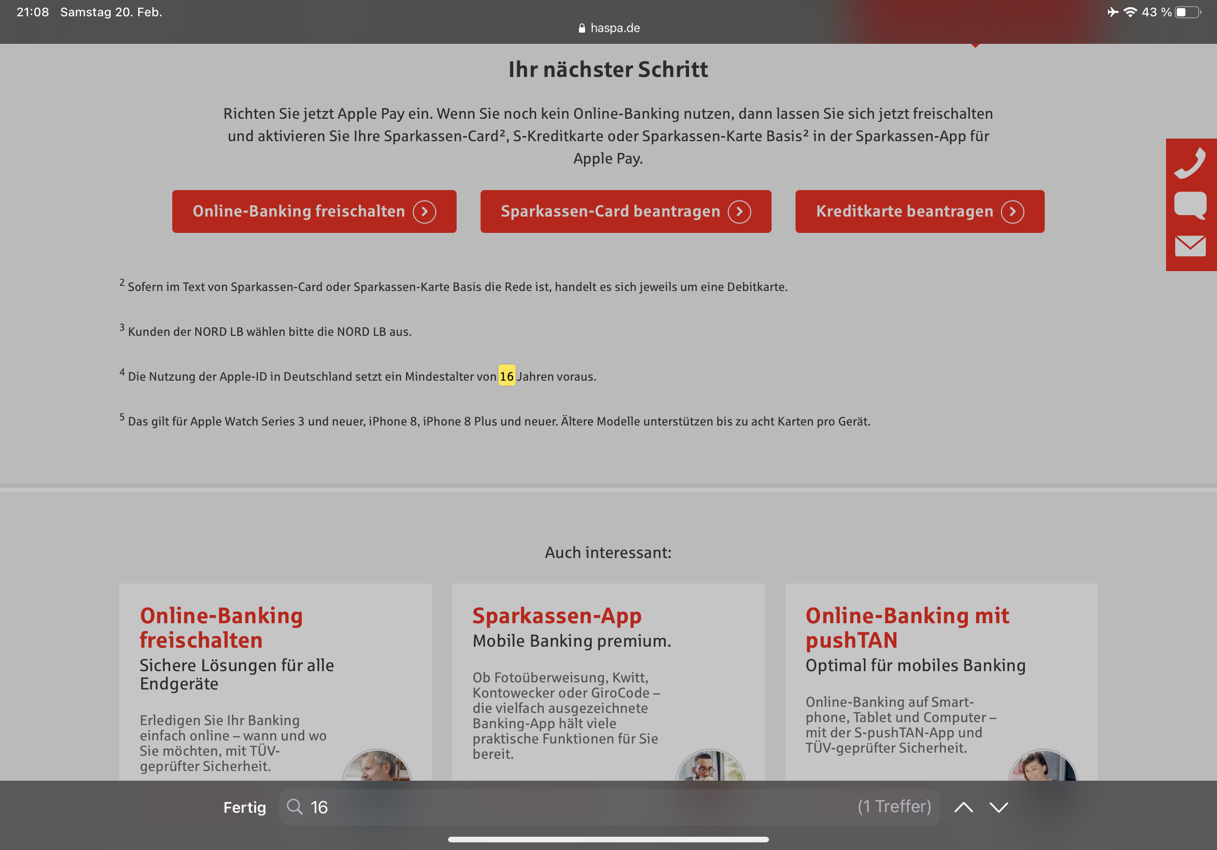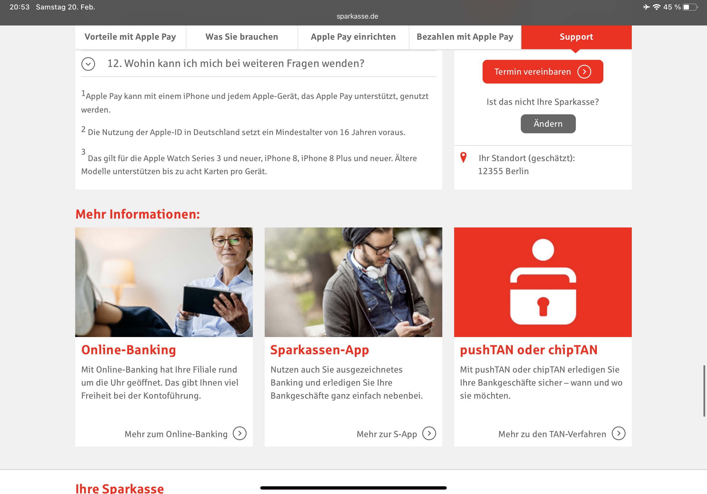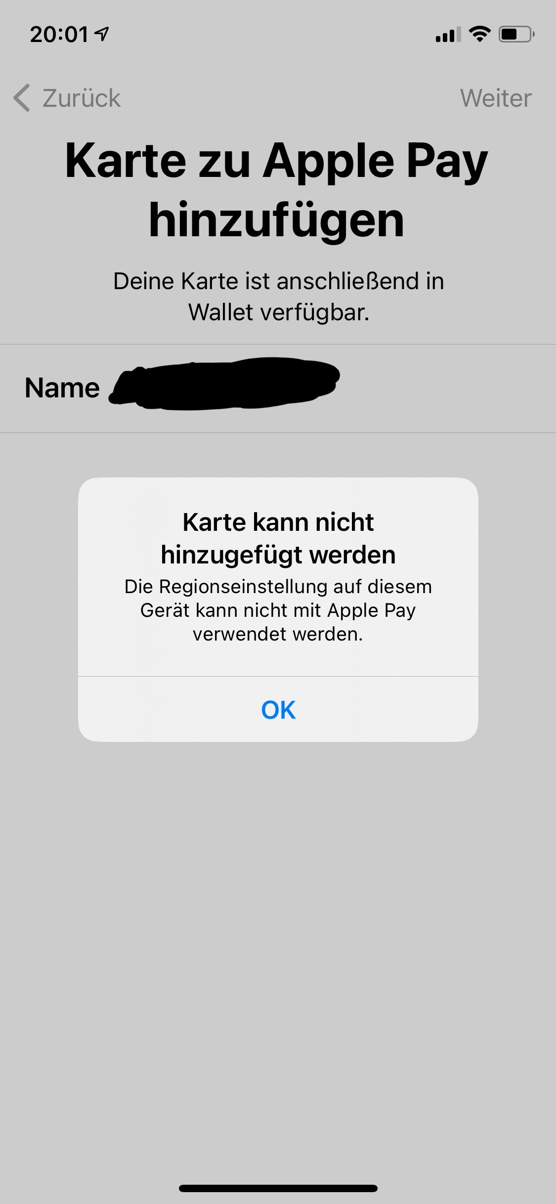 Es geht um das iPhone X meiner Schwester, diese hat eine Sparkassen virtual Debitkarte für Apple Pay erstellt. Wenn sie diese jedoch aus der Sparkassen App in die Apple Pay App überträgt wird sie zunächst nach ihrem Namen gefragt, den man nich ändern kann, als nächstes kommt dann immer die gleiche Fehlermeldung: Karte kann nicht hinzugefügt werden Die Reginonseinstellung auf diesem Gerät kann auf diesem Gerät nicht mit Apple Pay verwendet werden.