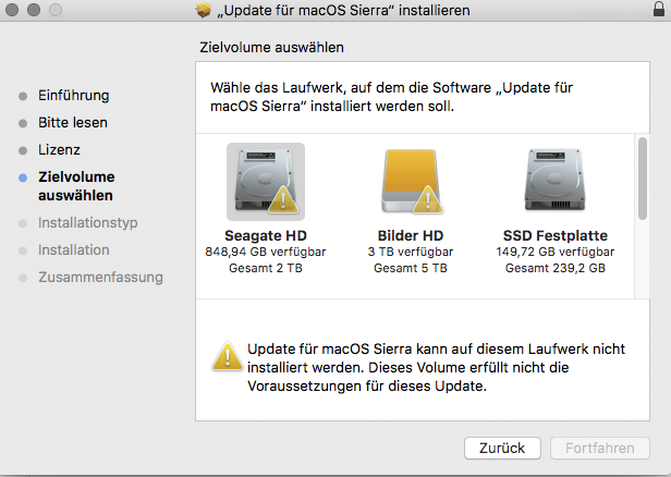 Habe versucht das Sierra Combo Update zu installieren und dabei die Meldung erhalten, das meine Festplatte nicht die entsprechenden Voraussetzungen erfüllt.