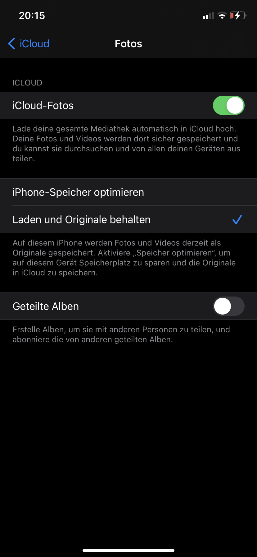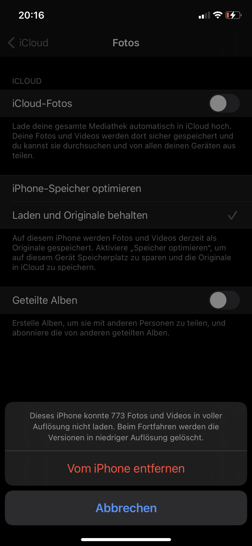Laden und Originale behalten ist aktiv. ( siehe 1. Foto) sollte ich jetzt jedoch iCloud Fotos deaktivieren bekomme ich eine Warnung (siehe 2. Foto). Wenn ich „vom Iphone entfernen klicken würde, wären dann die Fotos alle weg oder nur im icloud weg?