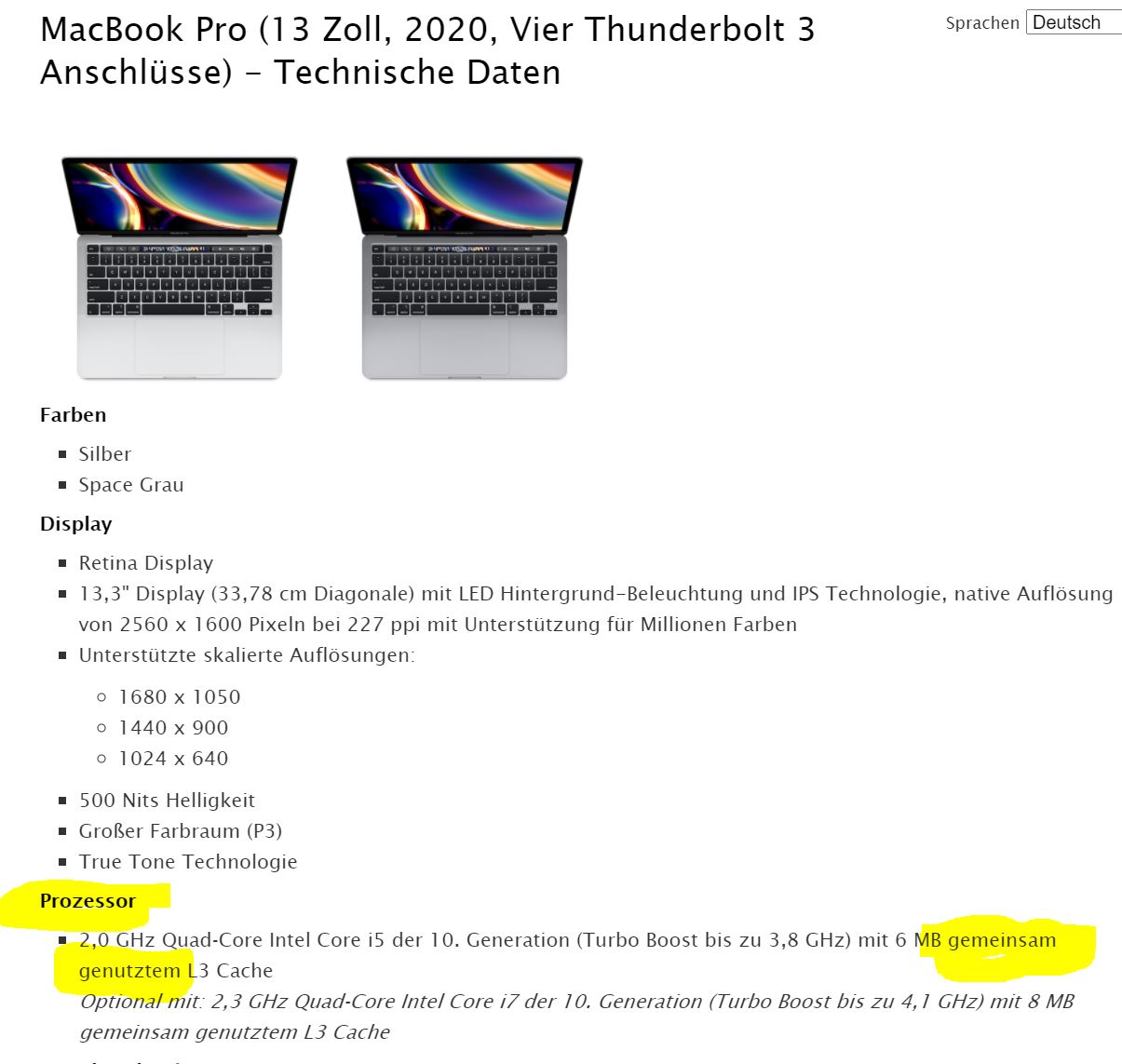 Auf der Rückseite des Kartons, des gebrauchten MacBooks, steht bei Prozessor: "2 Ghz Quad-Core Intel Core i5 mit 6MB geteiltem L3 Cache (Turbo Boost bis zu 3,8 Ghz)" wenn ich mir aber online auf der Apple-Website die Spezifikationen anschaue heißt es "2 Ghz Quad-Core Intel Core i5 mit 6MB gemeinsam genutzten L3 Cache (Turbo Boost bis zu 3,8 Ghz)"
