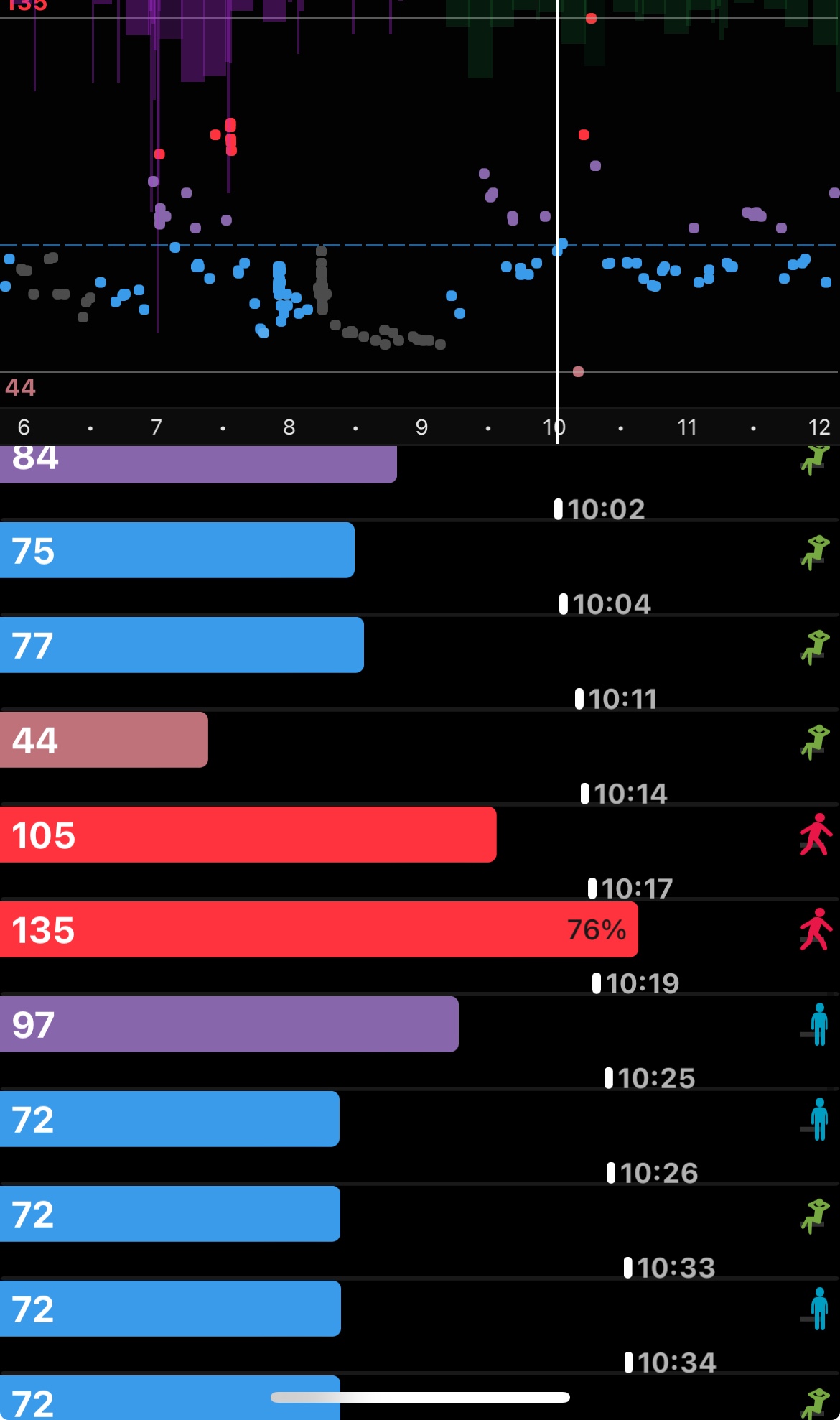 Ich erhalte keine Meldung über unregelmäßige HF Daten, ich bin auch nicht in Bewegung - meine Idee ist daher an sich nur dass durch eine schnelle Bewegung des Handgelenks so eine Messung zustande kommen kann. Das oben beschriebene Muster ist an sich immer gleich und nur bei niedrigen Puls.