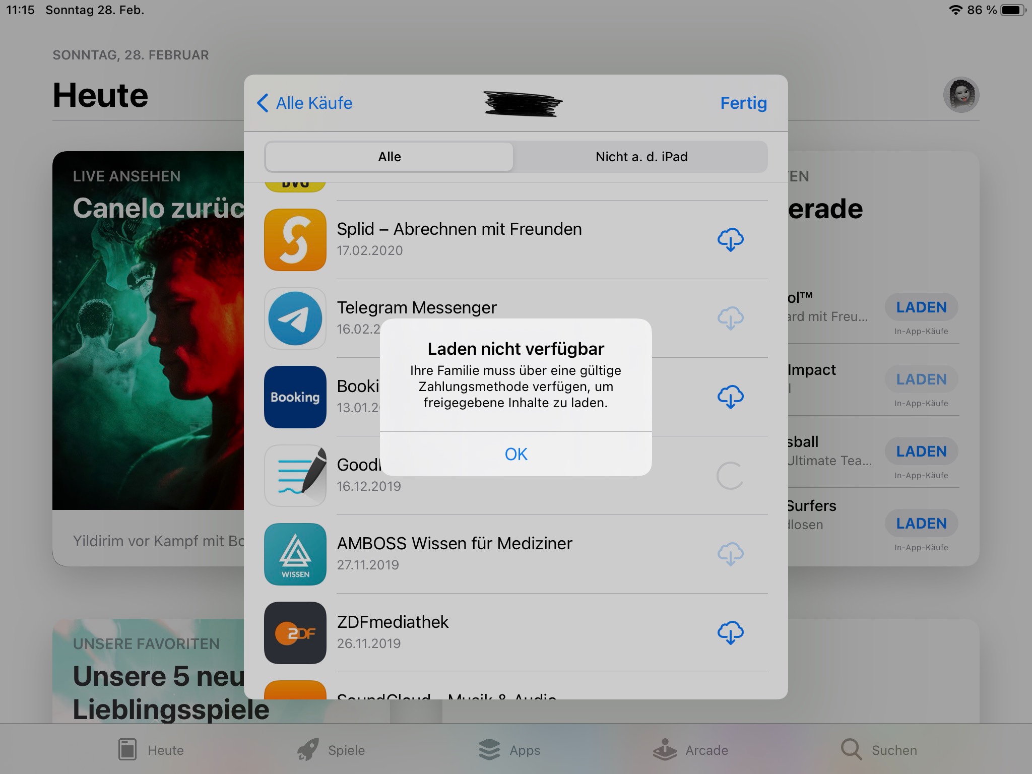 Familienfreigabe Fehlermeldung: "Laden nicht verfügbar. Ihre Familie muss über eine gültige Zahlungsmethode verfügen, um freigegeben Inhalte zu laden."